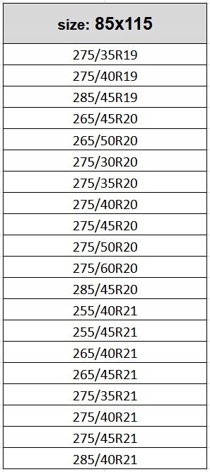 Підходить до розмірів шин: 275/35R19, 275/40R19, 285/45R19, 265/45R20, 265/50R20, 275/30R20, 275/35R20, 275/40R20, 275/45R20, 275/50R20, 275/60R20, 285/45R20, 255/40R21, 255/45R21, 265/40R21, 265/45R21, 275/35R21, 275/40R21, 275/45R21, 285/40R21.