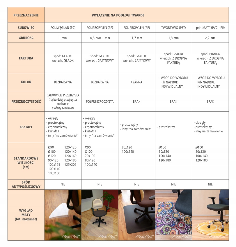 Нижче наведено порівняння всіх типів килимків для стільців, які ми пропонуємо: