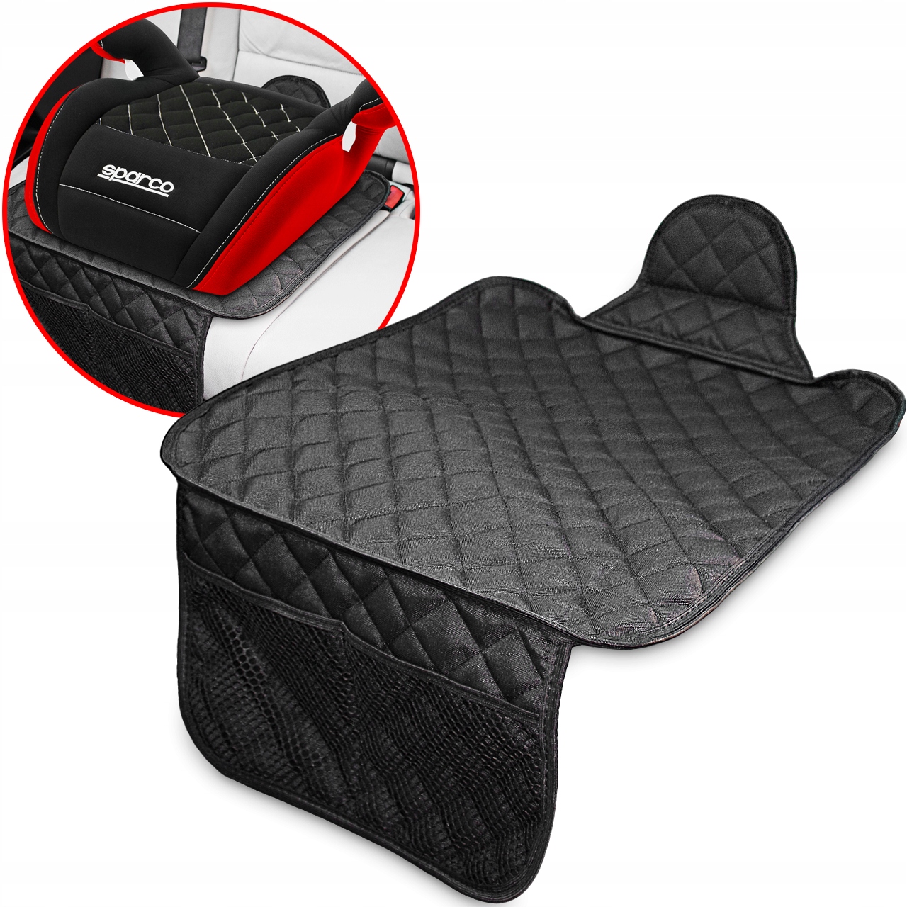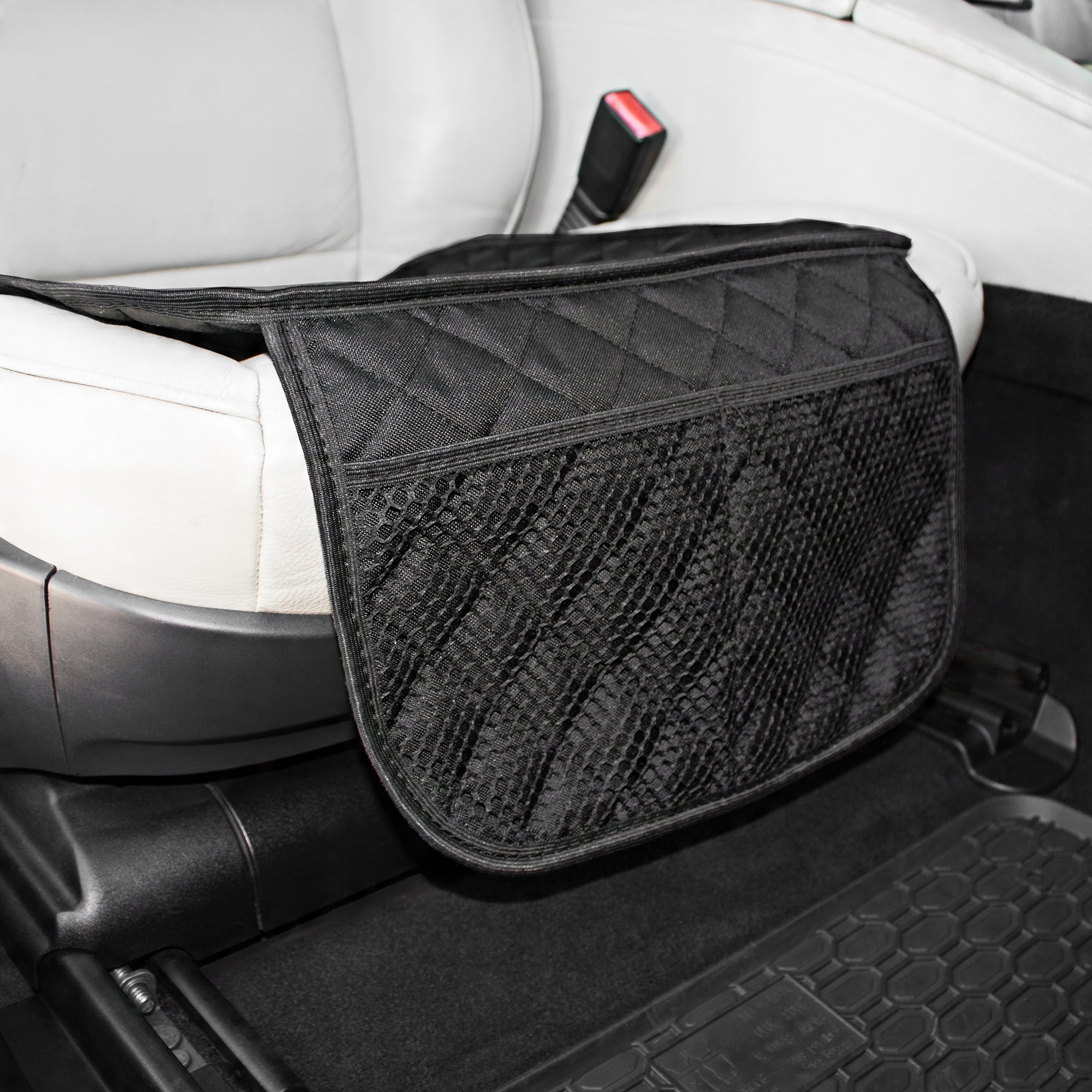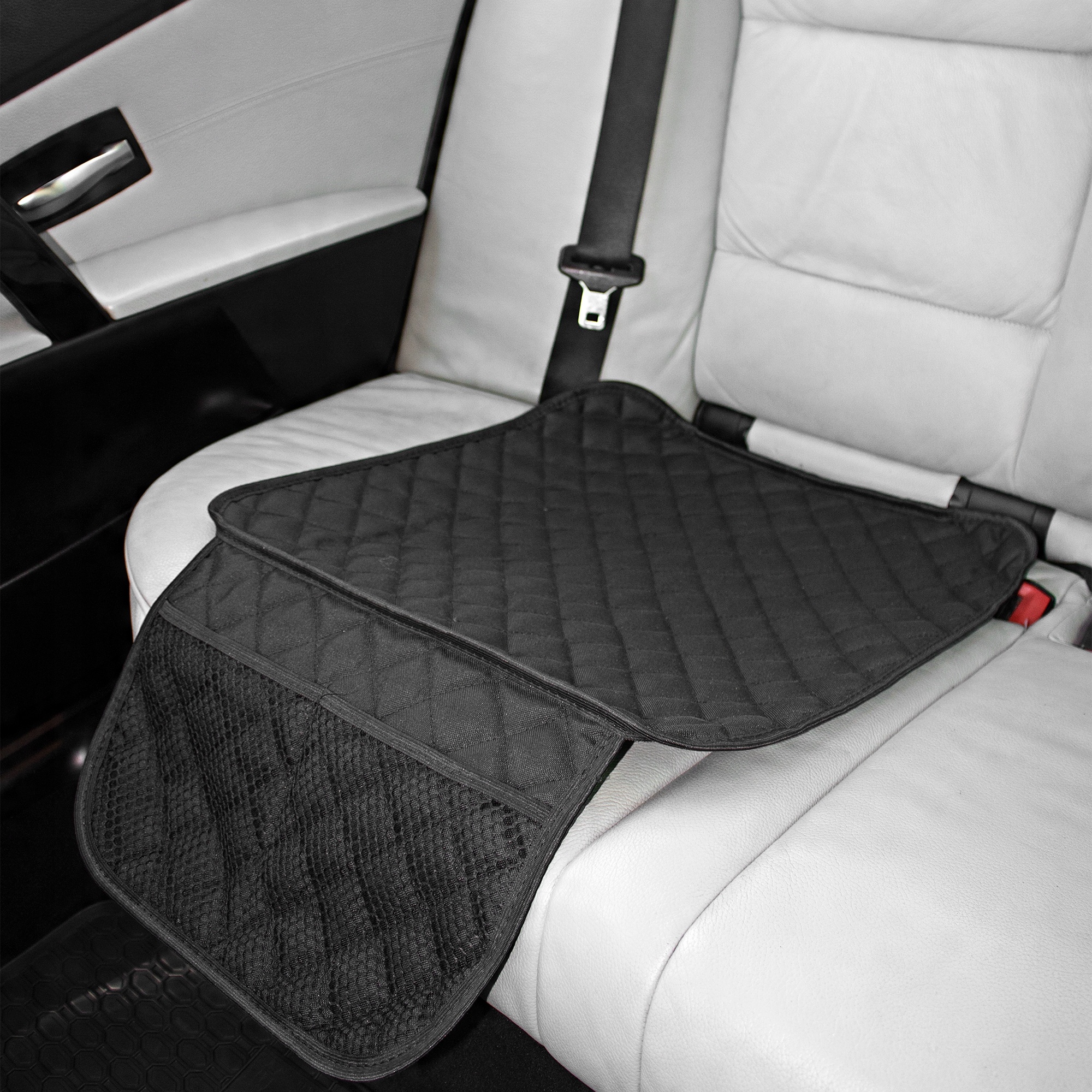 Для кращої організації простору в автомобілі килимок оснащений двома нижніми кишенямиз сітки, в які можна заховати дитячі дрібнички, наприклад, пляшку з водою або іграшки .