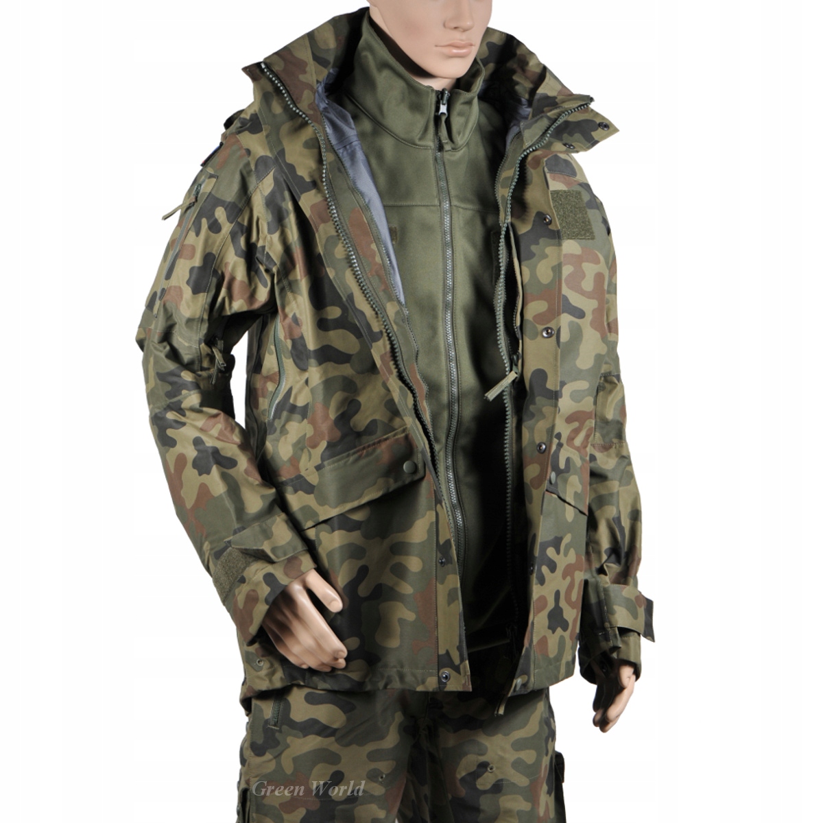 Матеріал: тришаровий ламінат із двокомпонентною мембраною на основі PTFE з зовнішньою поліамідною тканиною кольору хакі з камуфляжним принтом «пантера» та підкладкова тканина поліамід
