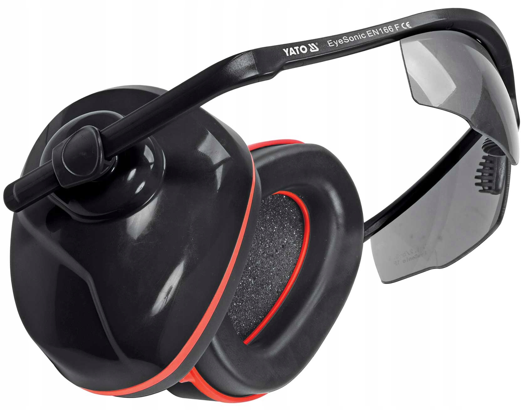Антишумні навушники від YATO, інтегровані зі змінними сірими захисними окулярами. Вони захищають не лише слух, але й очі користувача. Регульовані дужки на кульових шарнірах також виконують функцію оголов'я, що дозволяє працювати, наприклад, із захисним шоломом без додаткового тиску на голову.