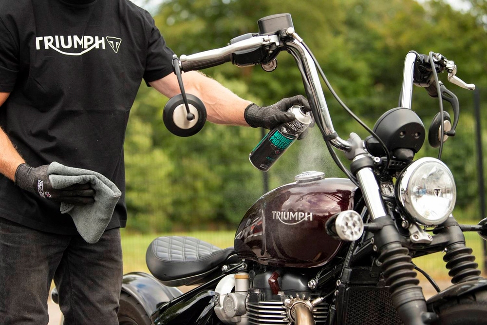 - Енергійно струсіть і нанесіть захисний засіб на мотоцикл, щоб розсіяти залишки вологи.