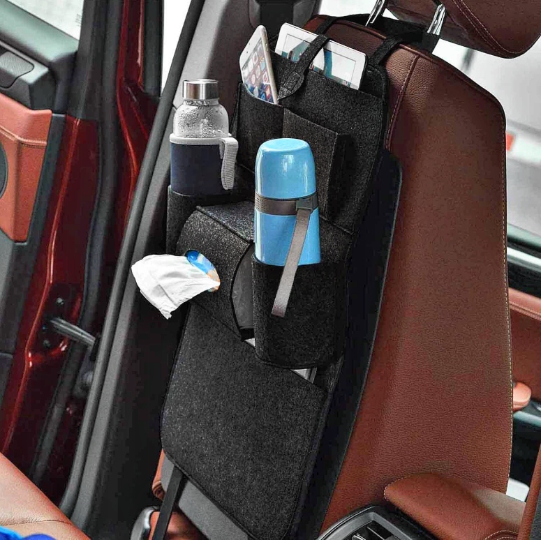 Отвори в дві сторони дозволяють легко помістити в нього коробку або сумку, а спеціально вирізаний отвір у центральній частині кишені дозволяє виймати окремі серветки, не витягуючи всю річ з органайзера. Дві вертикальні плоскі кишені, розташовані по центру, забезпечують простір для додаткових речей. Дві наступні крайні кишені ширші, і в них легко поміститися менша банка, пляшка з напоєм або дитяча пляшка.