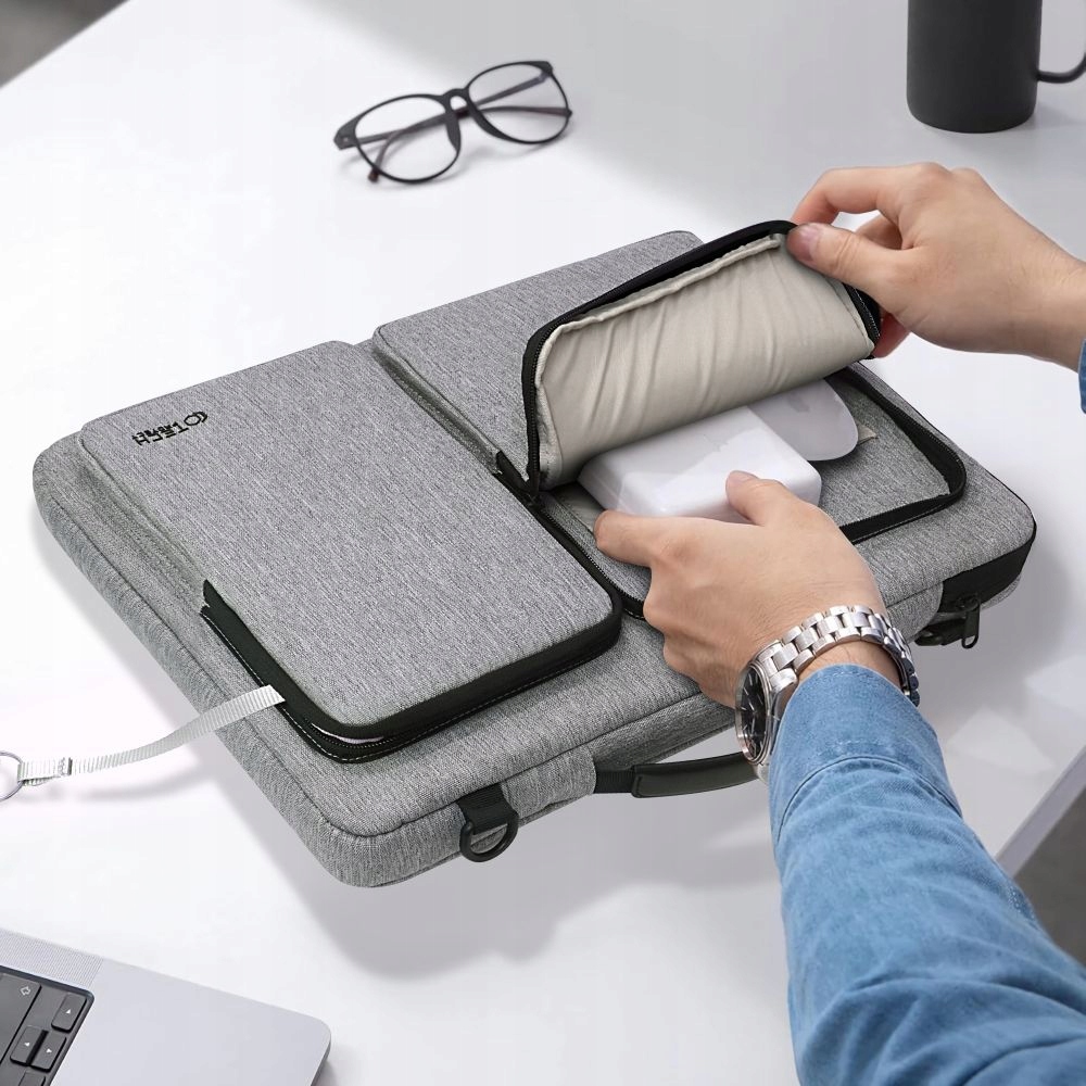 Система продуманого зберігання включає чотири практичні кишені: головну камеру, вистелену м'якою плюшем, яка захищає ноутбук від подряпин, задній кишеню для документів та дві передні кишені, закриті блискавкою, ідеально підходить для аксесуарів, зарядних пристроїв чи інших дрібничок. Елегантний дизайн та міцні матеріали роблять сумку ідеально вмістити в щоденний стиль, і в той же час гарантує надійність у будь -якій ситуації.
