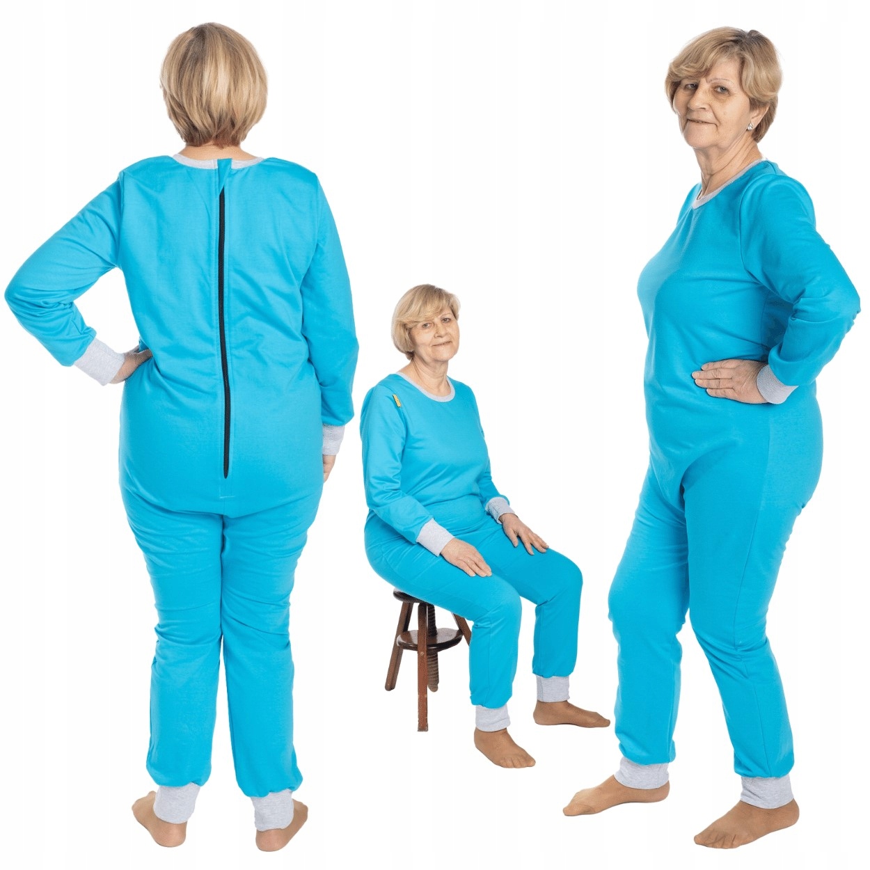 Кілька місць розташування блискавок (пластик) і застібок /нержавіюча сталь/ роблять одяг адаптованим до потреб і захворювань. людей, що ходять і лежать.