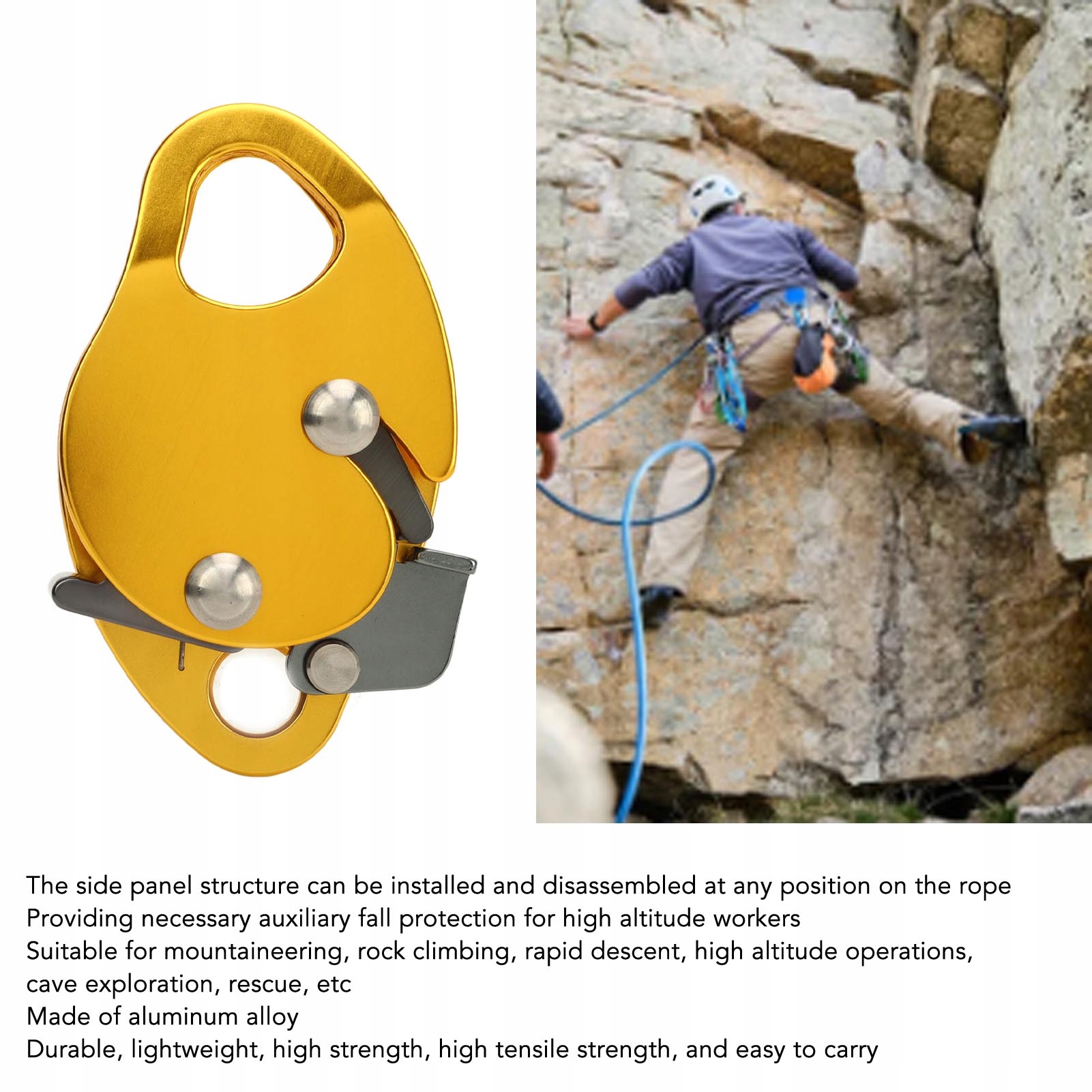 2. Матеріал алюмінієвого сплаву: рукоятка для альпіністської мотузки виготовлена з алюмінієвого сплаву, який є міцним, легким, має високу міцність, міцність на розрив і його легко носити.