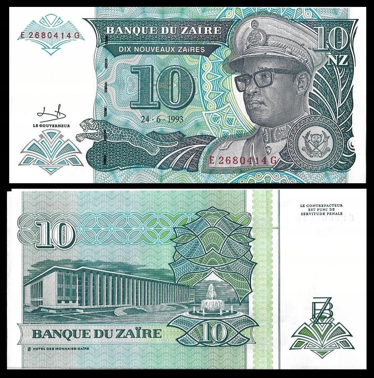 ZAIR 10 Nouveaux Zaires 1993 P-55 UNC