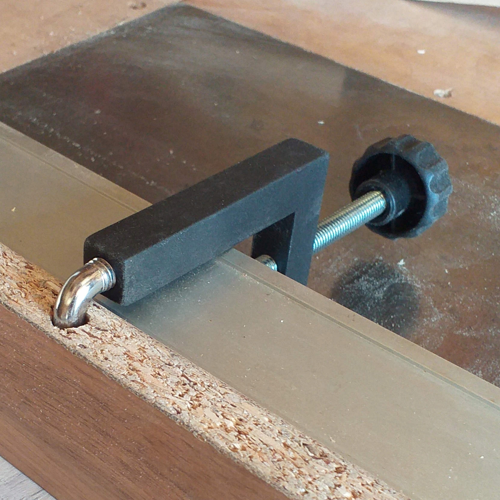 Рука зігнута таким чином, щоб міцно притискати матеріал, навіть якщо гвинт помірно затягнутий.