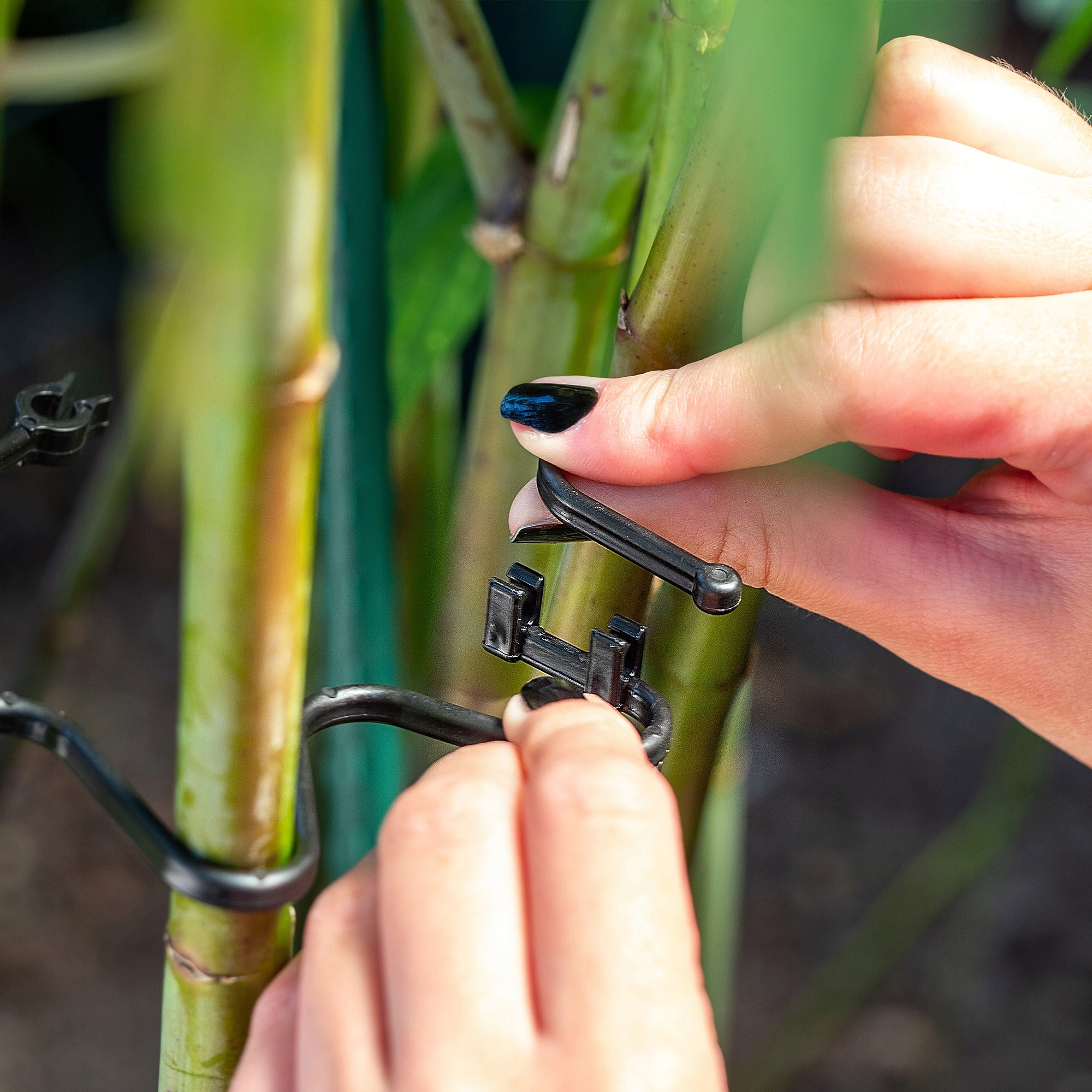 Опора для рослин має сучасну застібку, яка дозволяє з’єднувати кілька затискачів разом.