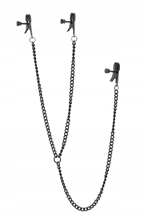 Набір чорних металевих затискачів для сосків, кожен на металевому ланцюжку 20 мм см , а також прикріплений кліторальний затискач на металевому ланцюжку довжиною 32 см.