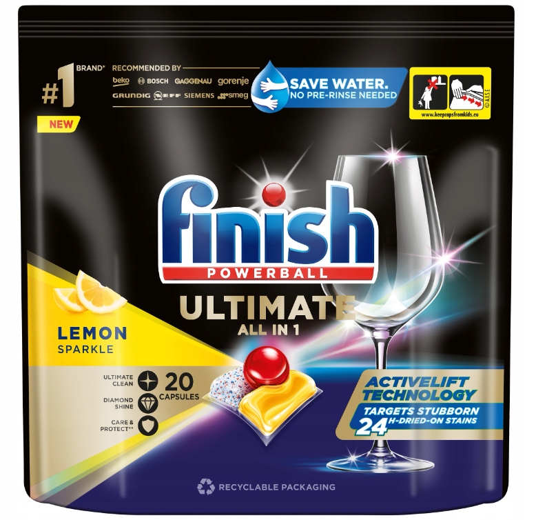 Фінічна кінцева капсули - це незамінний помічник на кожній кухні. Їх інноваційна формула Cyclesync ™ дозволяє поступове вивільнення інгредієнтів під час циклу промивання, що гарантує ідеальні результати незалежно від типу бруду. Використання цієї технології виключає потребу в початковій миттям посуду, заощаджуючи до 48 літрів води на тиждень. Finish Ultimate не тільки забезпечує бездоганну чистоту, але й захищає посудомийну машину від осадження каменю і продовжує термін експлуатації фільтрів. Завдяки цьому ви можете насолоджуватися ідеально чистими стравами та піклуватися про навколишнє середовище.