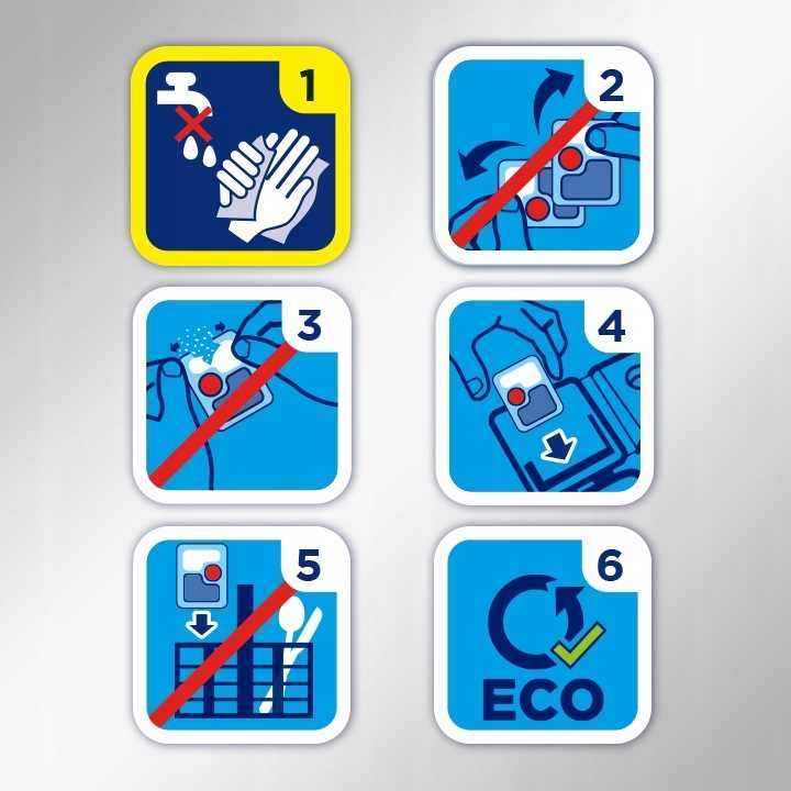 ➡ до кожного промивання помістіть одну капсулу в сухий дозатор. Найкращі результати використання з програм екологічно або автоматично.