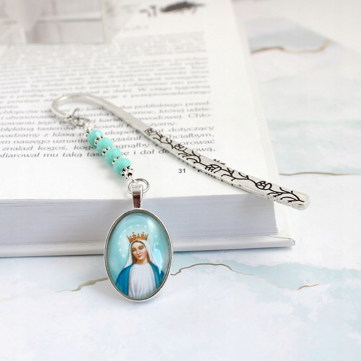 Закладка з елементів сріблястого кольору, прикрашена релігійним мотивом Богоматері, укладеним під опуклим склом і скляними намистинами.