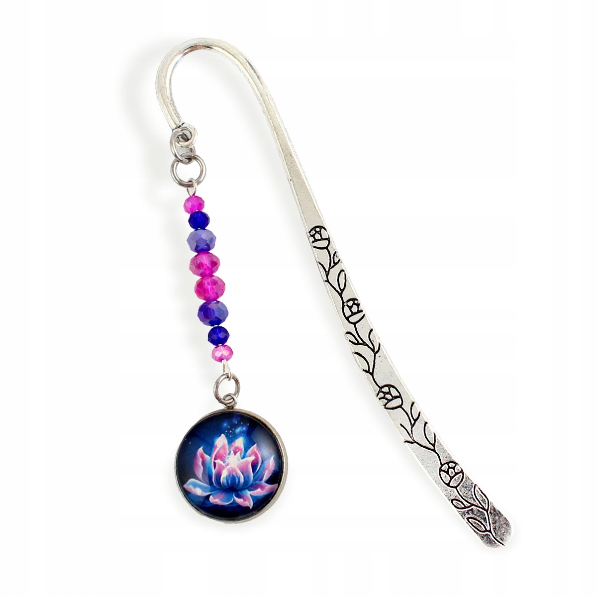 Закладка з елементів сріблястого кольору, прикрашена зображенням лотоса, закритого під опуклим склом. Фіолетовий і рожевий кольори надають їй містичного характеру – ідеальний подарунок на будь-який випадок і унікальне доповнення до вашої улюбленої книги.