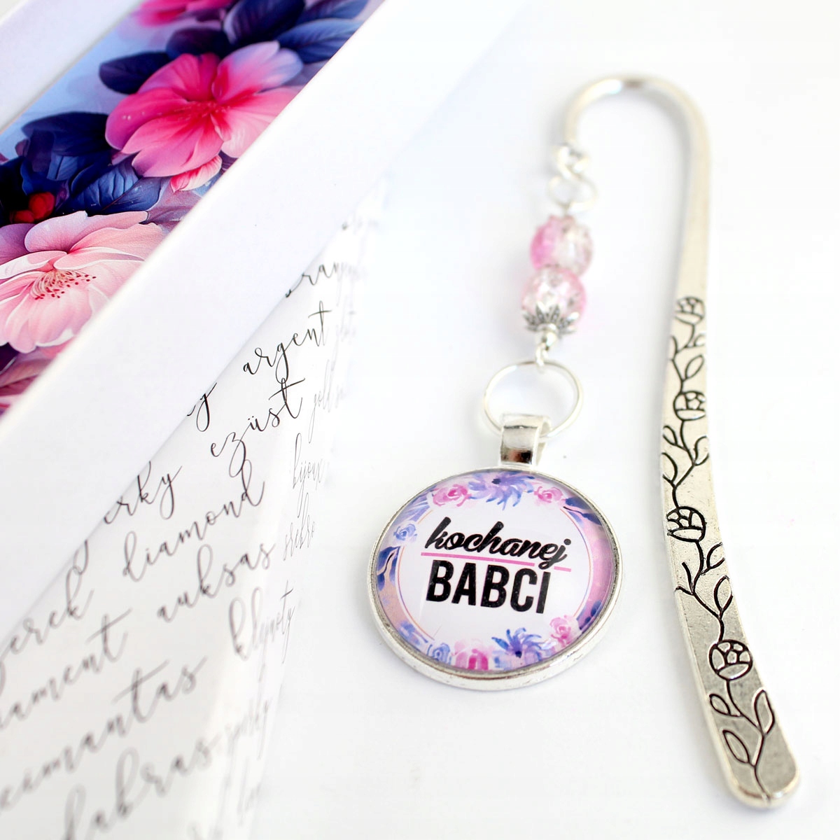 Закладка виконана з елементів сріблястого кольору, прикрашена тонким рожевим бісером і малюнком з написом "Люба бабуся". Ідеальний подарунок на день бабусі, іменини або як теплий подарунок без приводу.