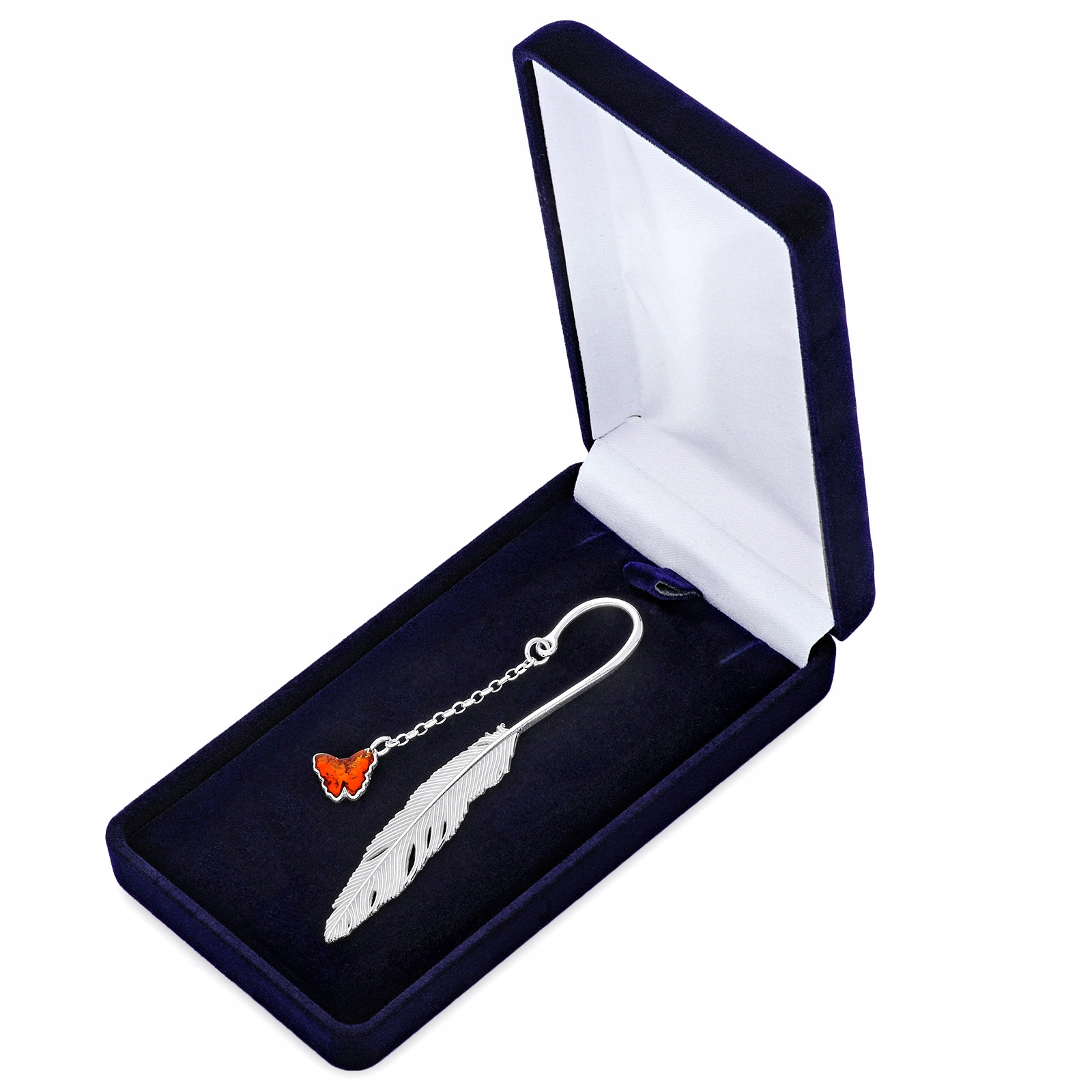 Срібна закладка у формі пташиного пера з маленьким метеликом, підвішеним на ланцюжку довжиною 3 см. Метелик, вирізаний з натурального балтійського бурштину, підібраний до срібної оправи. Бурштин коньячного кольору. Ми додаємо сертифікат автентичності бурштину до кожного нашого продукту.