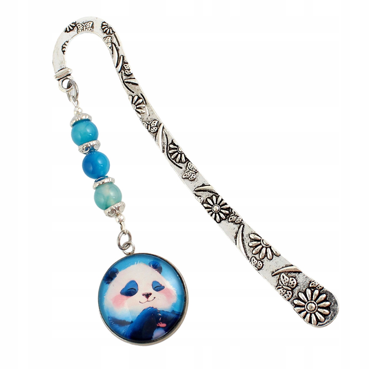 Закладка виконана з античних елементів сріблястого кольору, прикрашена милим оригінальним зображенням панди, укладеним під опукле скло. Стиль ілюстрації відсилає до казкової естетики – сповнений м’якості та делікатності.