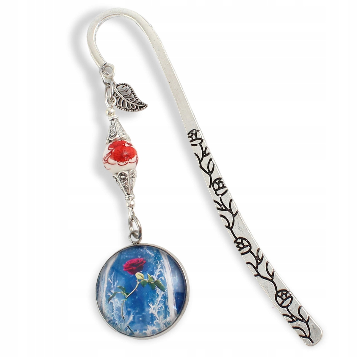 Закладка з атмосферним мотивом троянди під скляним куполом - символом любові та надії. Виготовлена з елементів сріблястого кольору, прикрашена керамічною намистинкою та листочком. Ідеальний подарунок для людини, яка вірить у силу казки та красу, приховану в дрібних деталях.