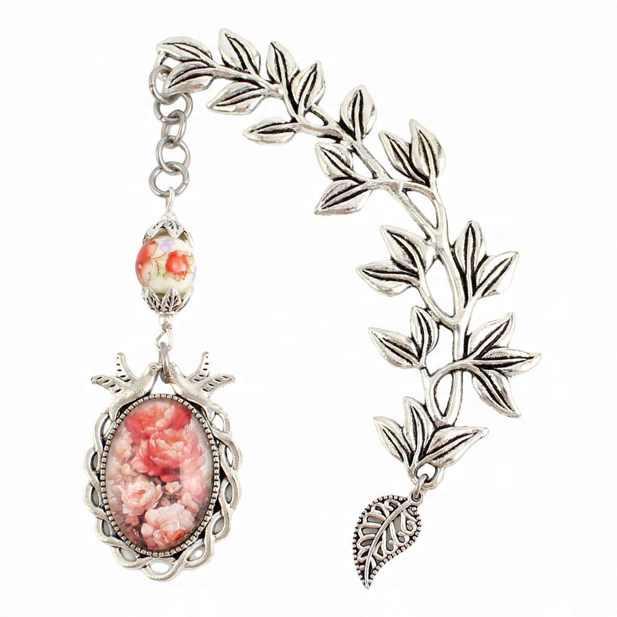Унікальна закладка зі старовинних сріблястих елементів, прикрашена зображенням квітів півонії під опуклим склом і керамічною намистинкою. Ідеально підходить як подарунок, так і вишуканий подарунок для любителів квітів і красивих ілюстрацій.