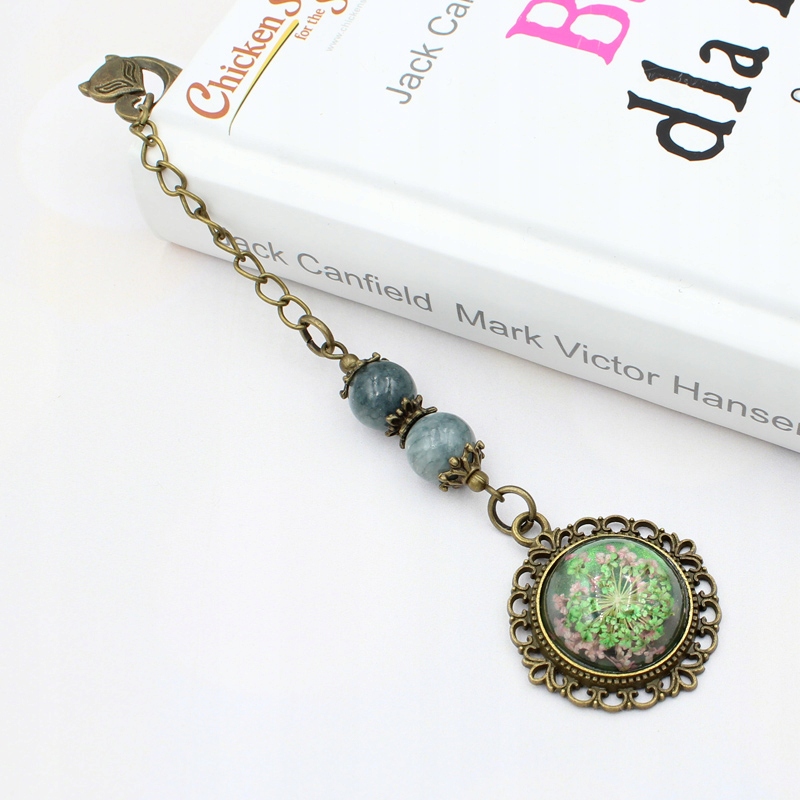 Закладка ручної роботи зі справжніми засушеними квітами в античній коричневій основі та з кульками з натурального каменю - сіра яшма.