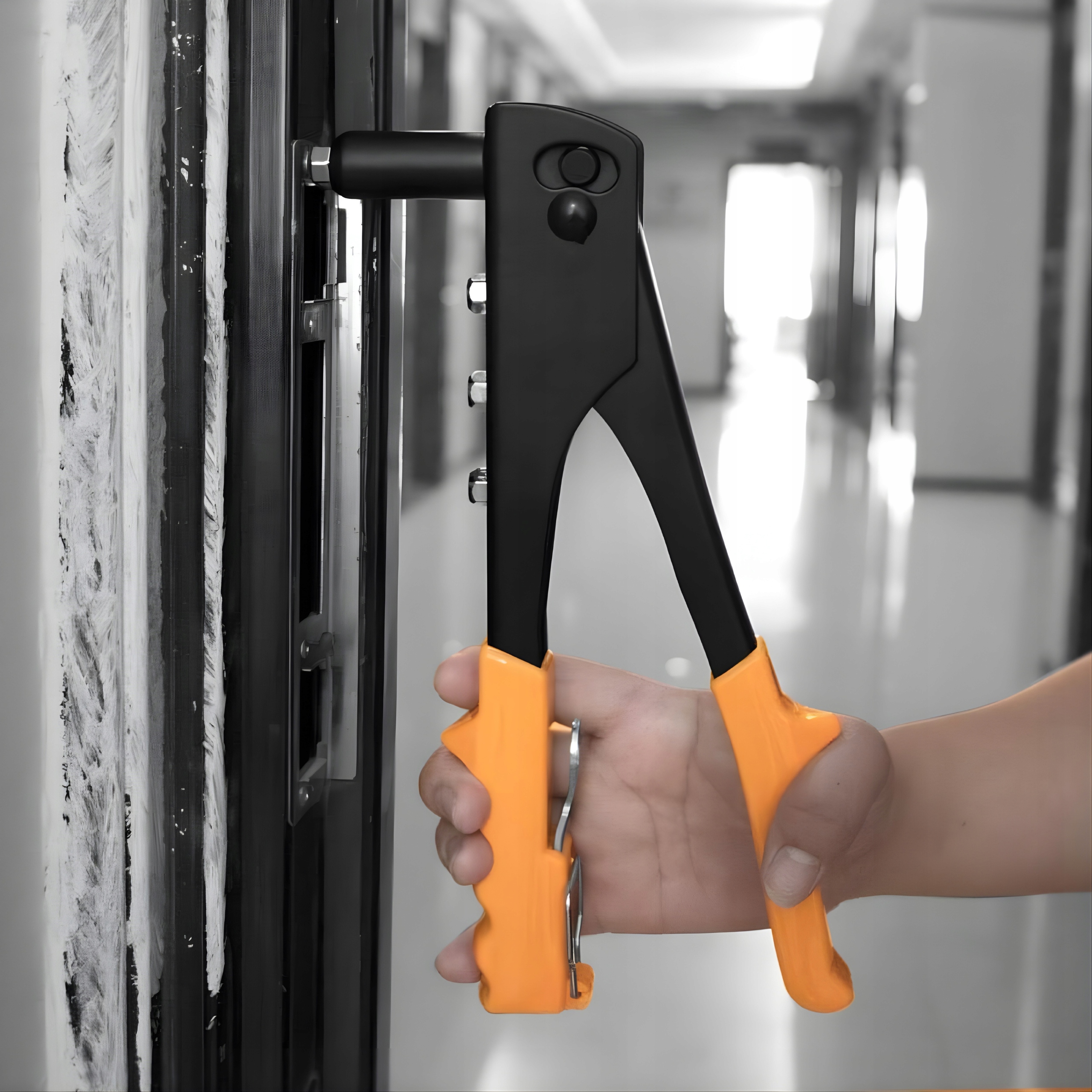 Вставте головку заклепки в попередньо просвердлений отвір відповідного діаметру та застосуйте пістолет для заклепок.