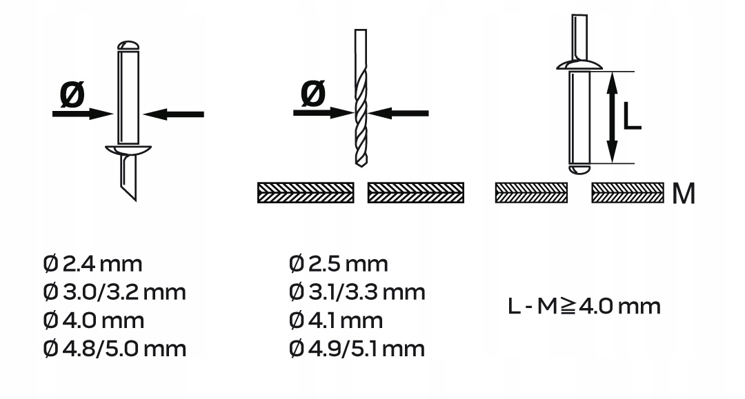 - Для заклепок із розміри: 2.4, 3.2, 4.0, 4.8