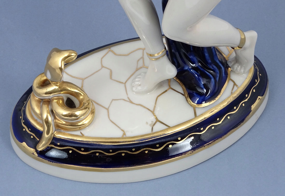 Фігура напівоголеної жінки, що стоїть на овальному постаменті, підперезана золотим поясом, з якого темно-синій пояс вільно звисає спереду та ззаду. Унизу позолочена згорнута кобра з трохи піднятою головою, яку чарівниця намагається приборкати рухами рук.