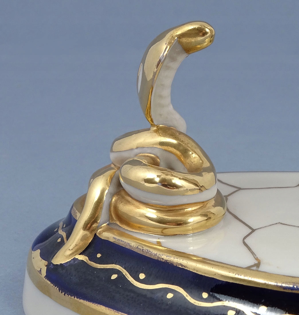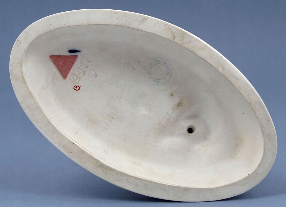 Розписана вручну та позолочена порцеляна, підписана на основі королівським дуксом. трикутник. Нижче в масі вибиті цифра 2977, цифра 9 і намальована цифра «15». Поруч — марка з написом «Зроблено в Чехословаччині».