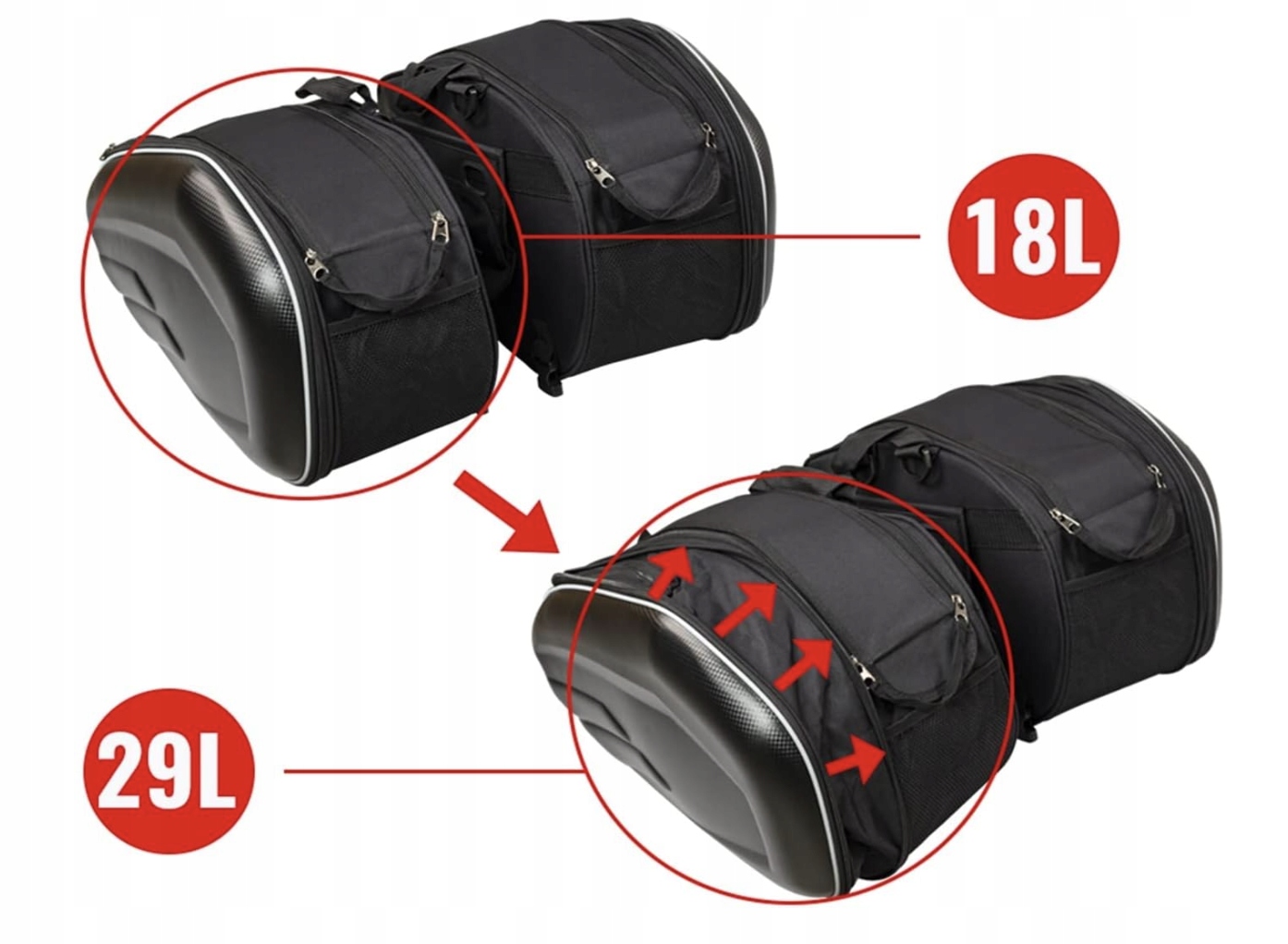 - Висока потужність: Пани для мотоциклів пропонують велику потужність від 36 до 58 л, з максимальною односторонньою ємністю 29 л . Завдяки цьому ви можете зберігати не тільки дрібні предмети, такі як гаманець або клавіші, але й більші речі, такі як мотоцикл. Це робить їх ідеальними як для коротких, так і для довгих подорожей. 4 Завдяки цьому ви можете транспортувати цінні предмети без страху навіть під час дощу. Крім того, набір включає дощову кришку , що забезпечує додатковий захист від вологи. 4 Вставка з утвореного термопласту збільшує жорсткість і підтримує аеродинамічну форму, що забезпечує стабільність під час руху. легкий, але суцільний дизайн гарантує довге життя. 4 Регульована ширина змушує їх відповідати більшості мотоциклів, що робить їх дуже універсальним рішенням. Установка швидка і не вимагає використання спеціальних інструментів. 4 Завдяки цьому ви можете зберігати мобільний телефон, гаманець, ключі та інші аксесуари в легко доступних місцях. Плечі підкладені та регульовані, що збільшує зручність використання.