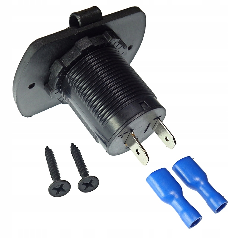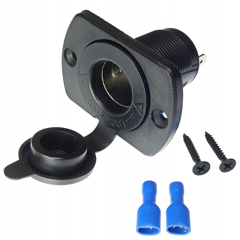 Плоска панель із вбудованим гніздом прикурювача на 12 В, оснащена кришкою, захищеною від бризок. Підключення джерела живлення до контактів за допомогою аксесуарів, що входять у комплект. ізольовані роз'єми F6,3 мм. Полярність джерела живлення вказана на корпусі біля контактів.