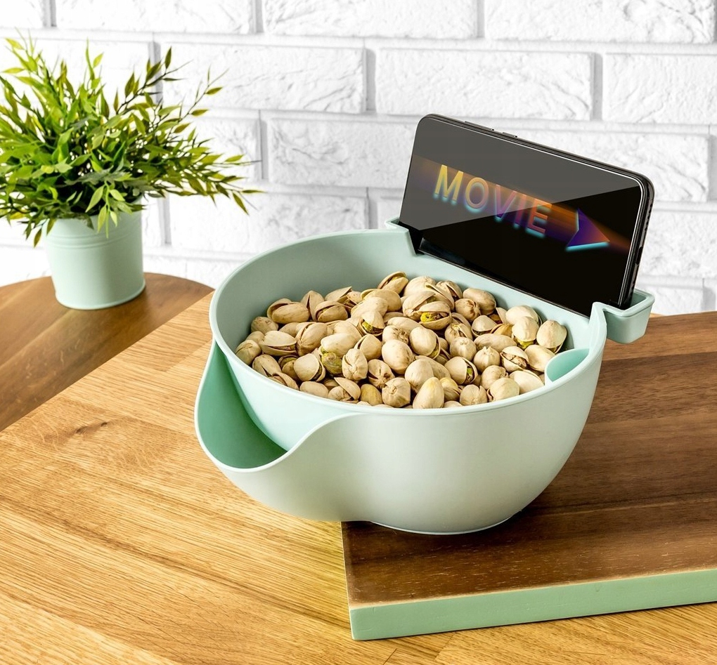 Чи може миска бути розумною? Виявляється, можна :) Супер практичне обладнання для всіх, хто любить перекусити під час перегляду фільмів, прослуховування музики чи вболівальників. Наша миска розумна, тому що складається з двох незалежних частин. У верхній лоток із ситечком ви можете помістити різні закуски, такі як арахіс, фісташки, насіння соняшнику, а також здорові, щойно вимиті, такі як помідори черрі, виноград, полуницю з хвостиками, вишні, варену квасолю та все, що вам подобається. , і вони мирно стечуть.на нижню підставку, де також є місце для насіння, стеблин, шкаралупи тощо.Миска також розумна, оскільки ви можете помістити свій смартфон у спеціальну кишеню та зручно дивитися улюблені програми, серіали чи слухати музику.