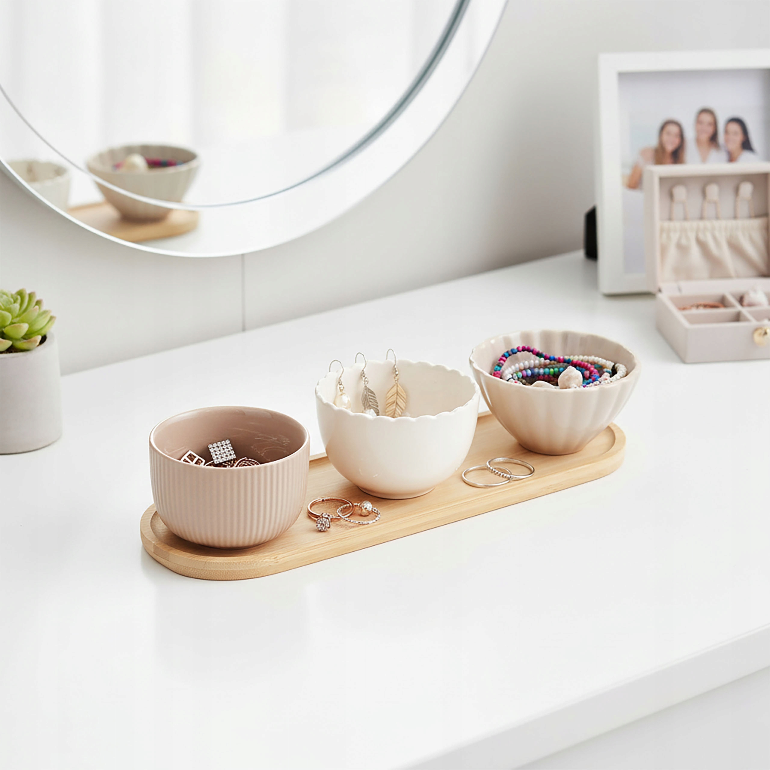 Цей набір для сервірування з 4 предметів являє собою комбінацію натурального бамбука та елегантного кераміку. У набір входить бамбуковий піднос і 3 чаші бежевого і кремового відтінків, які ідеально підходять для закусок, соусів, соусів або дрібних солодощів. Завдяки мінімалістичному дизайну набір ідеально підходить як для повсякденного використання, так і для зустрічі з гостями. Його також можна використовувати у ванній чи офісі - для зберігання дрібних аксесуарів.