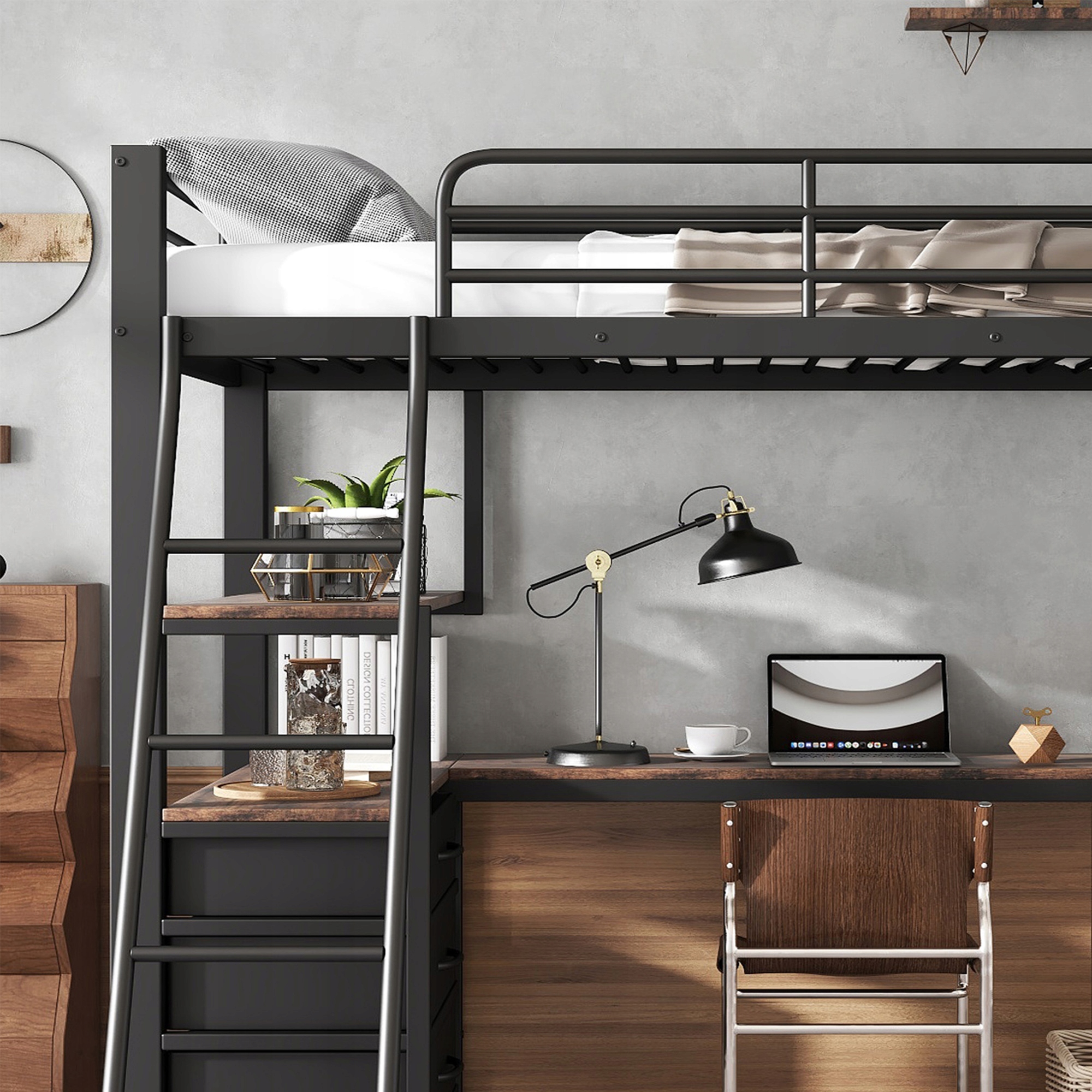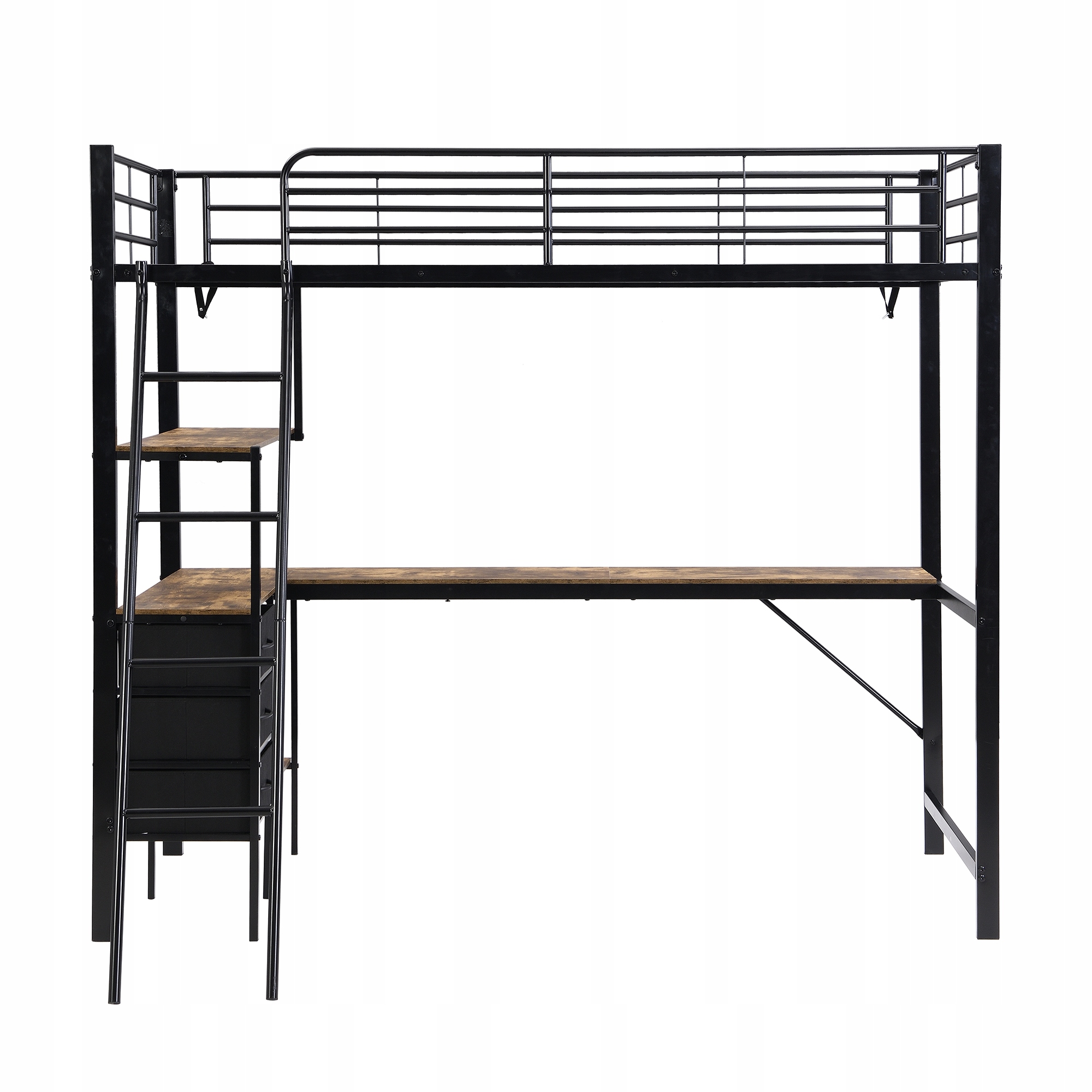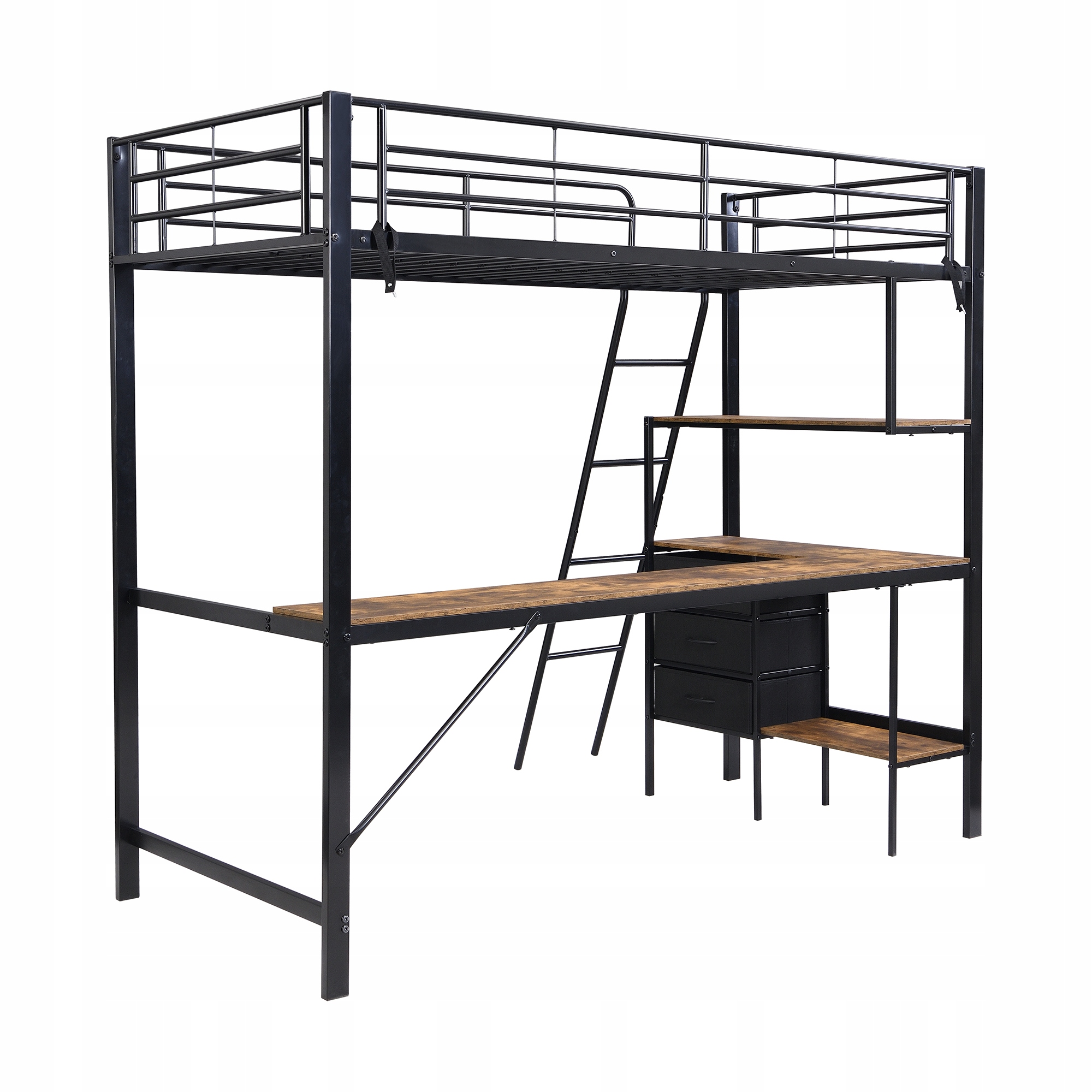 залізо, двоярусне ліжко, підходить для дітей та підлітків, три ящики, зі столом з довжиною 2 м, похилою драбиною з чотирма кроками, залізо + діловодом, чорний + темний горіх, 90x200см