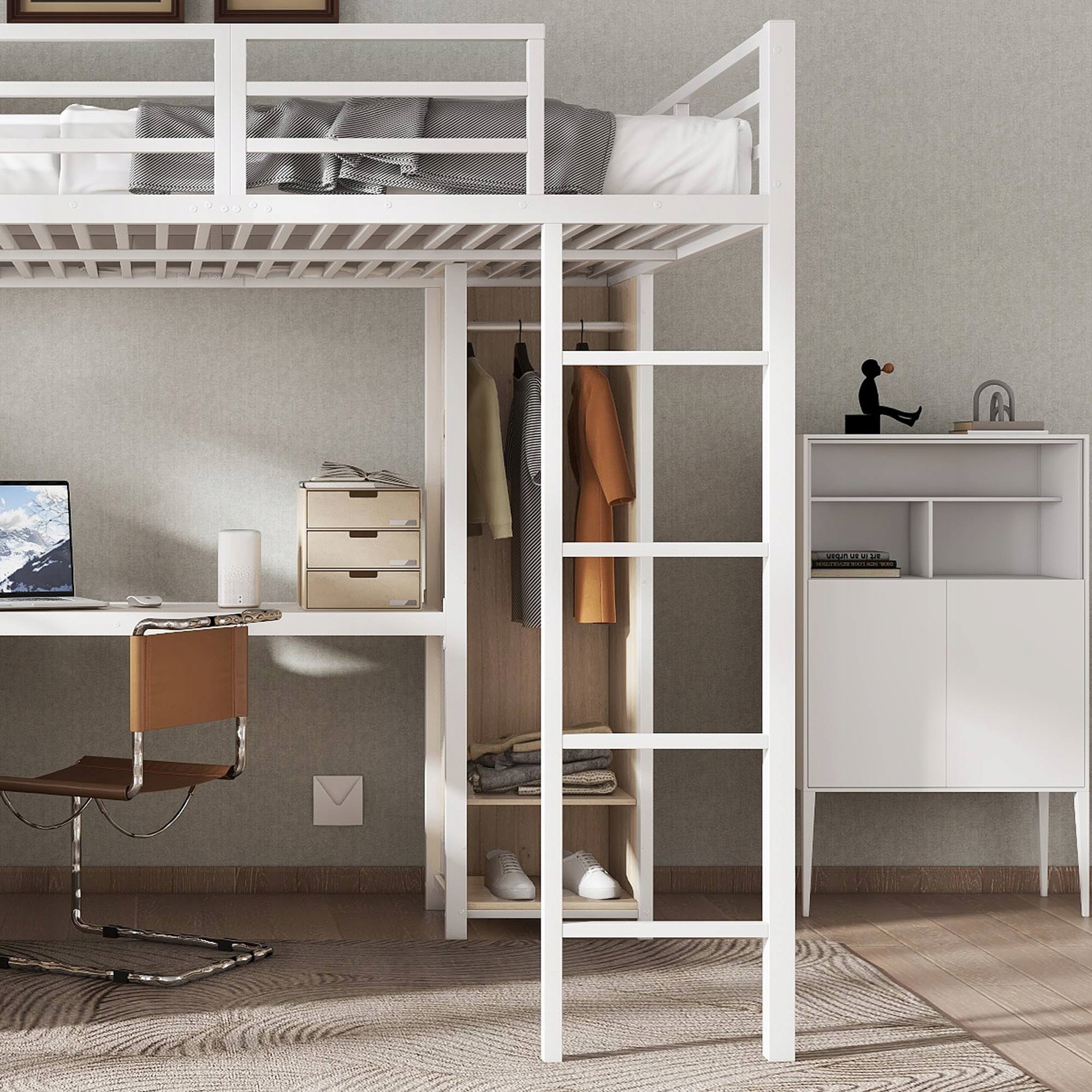 Залізне ліжко, двоярусне ліжко, дворівневе приміщення для зберігання під столом, верхнє ліжко з місця для зберігання, з гардеробом, залізною ділянкою +, білим, 140x200 см