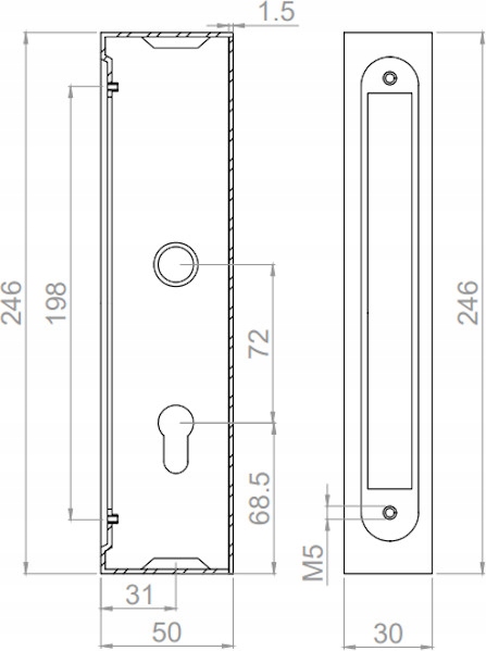 Касета з замком виготовлена з прямокутного металевого профілю 50х30 мм. Універсальна конструкція касети дозволяє встановити більшість наявних на ринку замків і ручок за умови збігу розмірів - всі ці елементи можна знайти в нашому магазині.