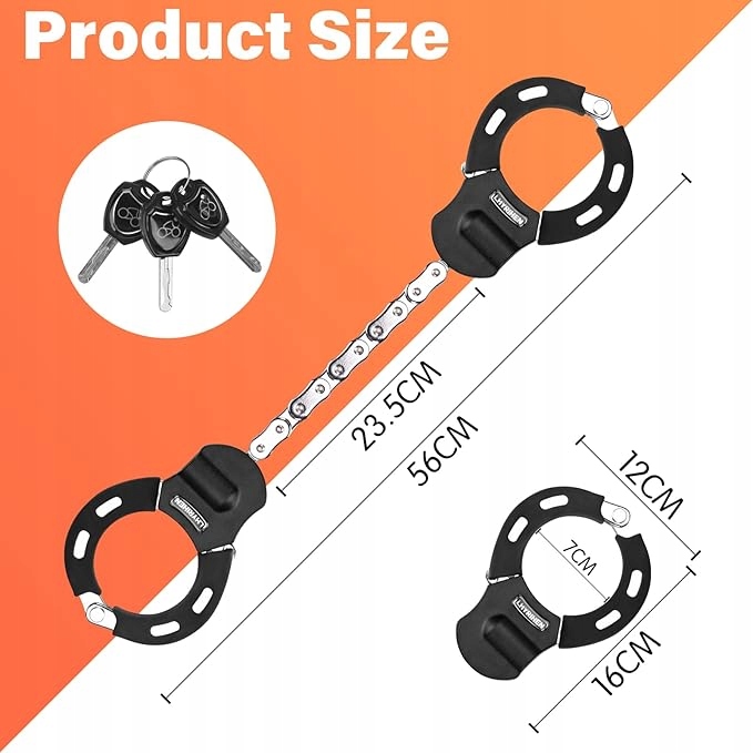 Посилений ланцюг: Загальна довжина велосипедного замка становить 56 см, а довжина ланцюга — 23,5 см. Потовщена та подовжена ланцюгова рейка має загартовану ламіновану сталеву структуру, що складається з дев’яти загартованих обертових ланок, вирізаних для міцності та безпеки.