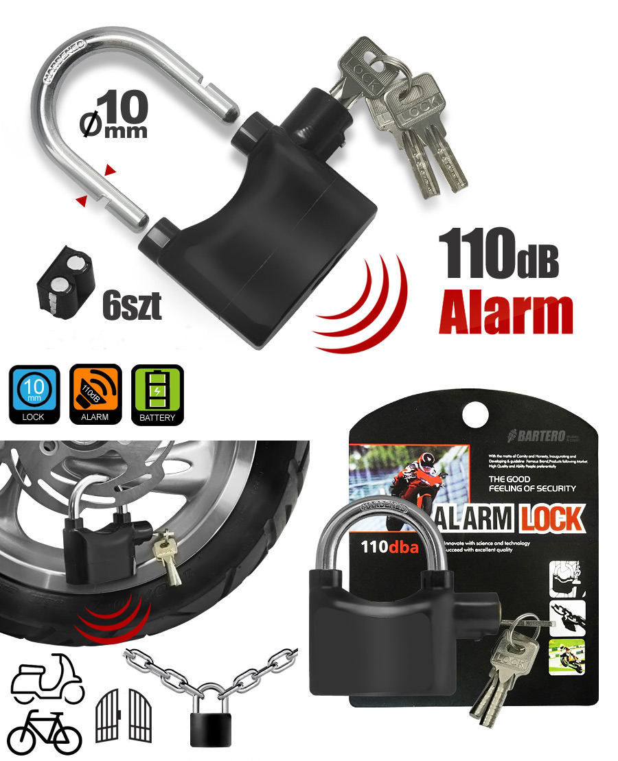 Дуже голосно, ефективно відлякує потенційних злодіїв. Дві функції: звичайний замок або замок із сигналізацією (залежно від арки). Сигналізація активується поштовху та спроби відкрити замок. Виготовлений з міцних матеріалів.