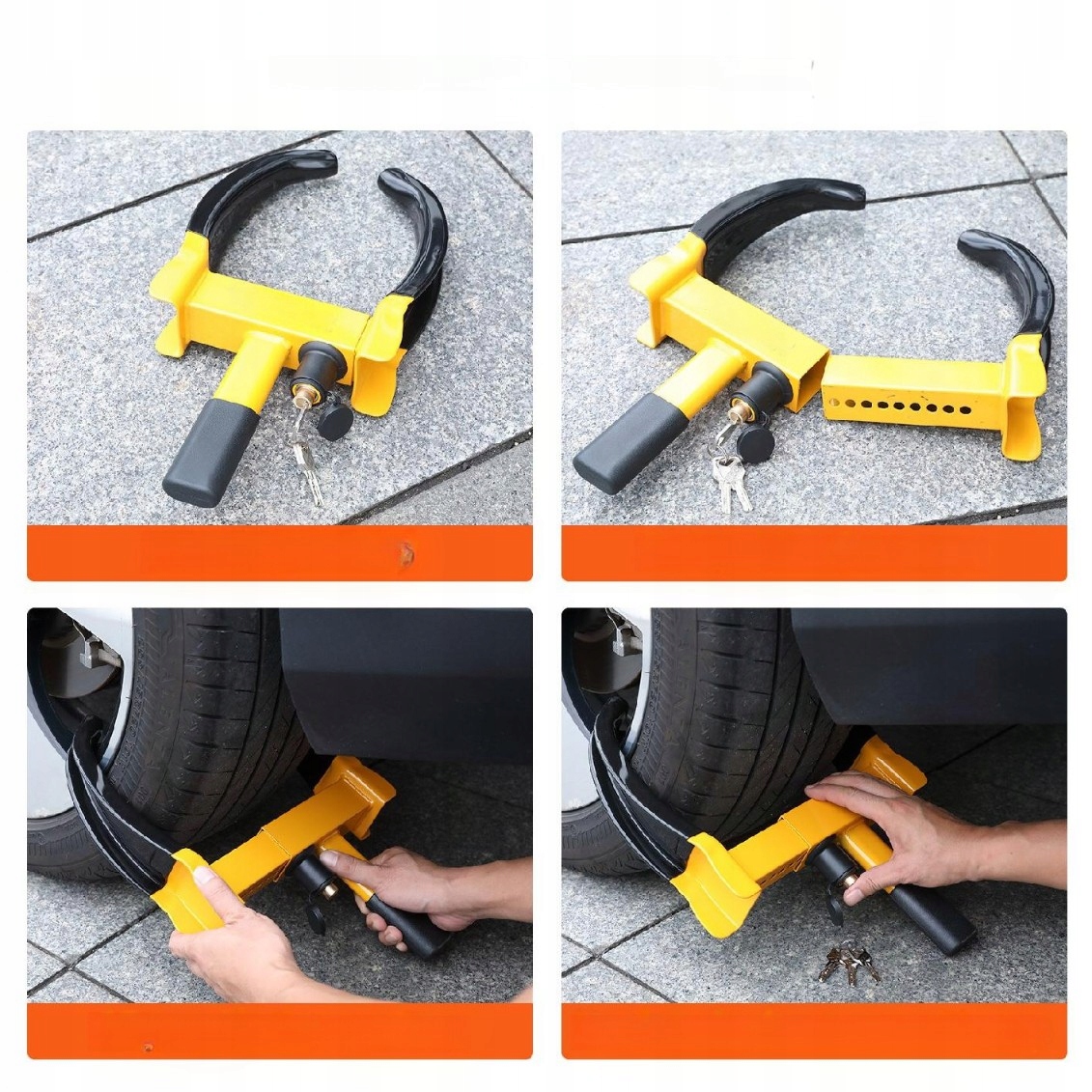 Колісний замок ідеально підходить для фіксації транспортних засобів на стоянках, у дворах, у супермаркетах, на заводах і під час тривалого зберігання. Підходить для легкових автомобілів, трейлерів, причепів та інших транспортних засобів, що потребують захисту.