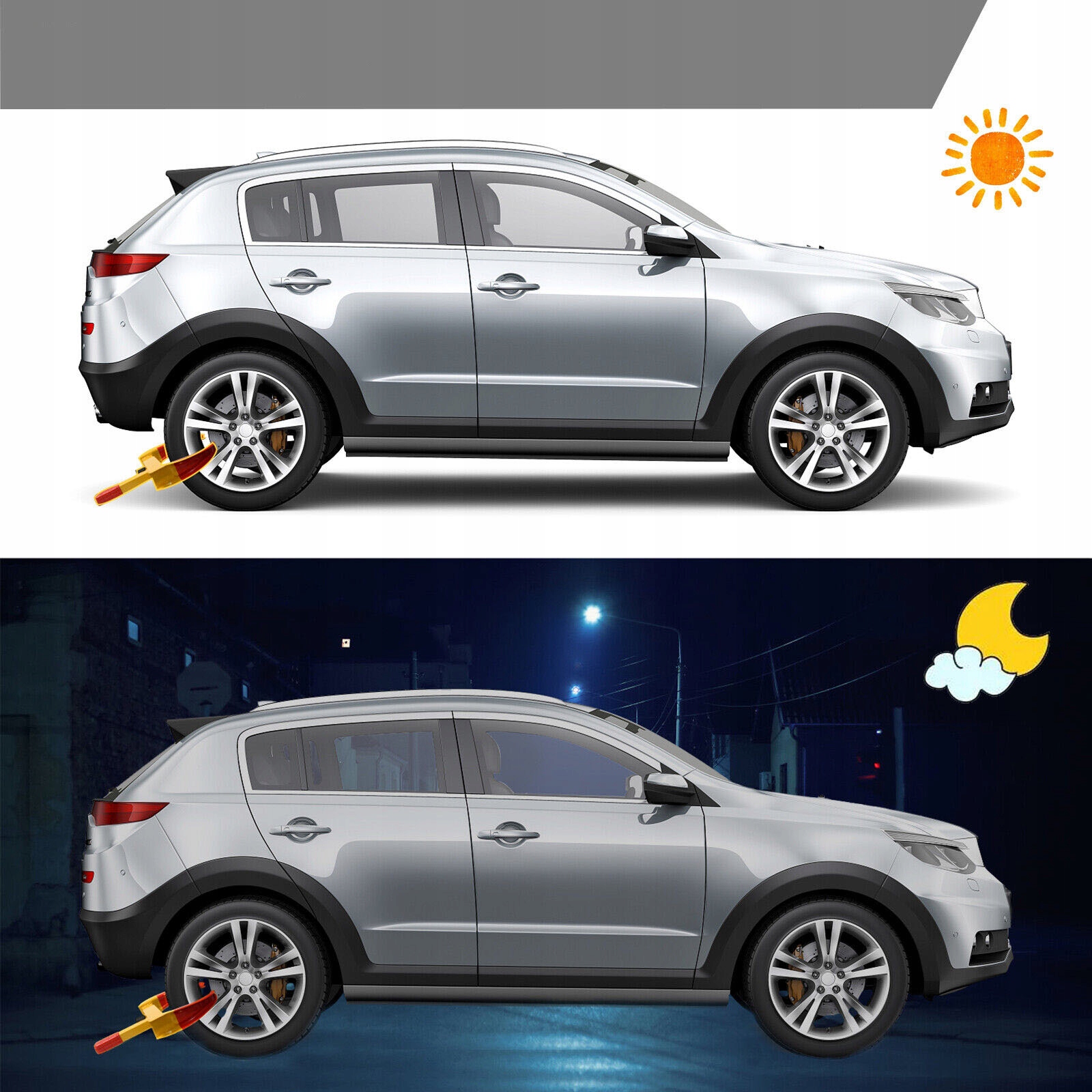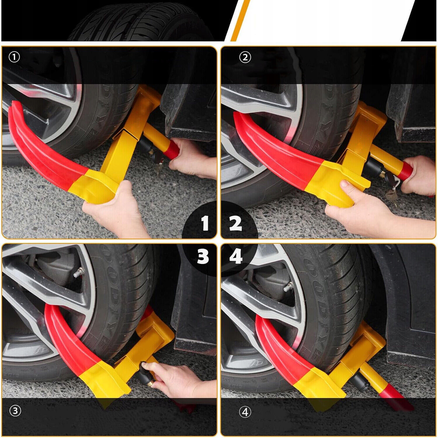 🚗 Ідеальне візуальне стримування: Яскраво-жовті та червоні замки коліс забезпечують найкращу видимість удень і вночі. Замок коліс значно знижує ризик бути спійманим злодієм і ефективно захищає ваш автомобіль.