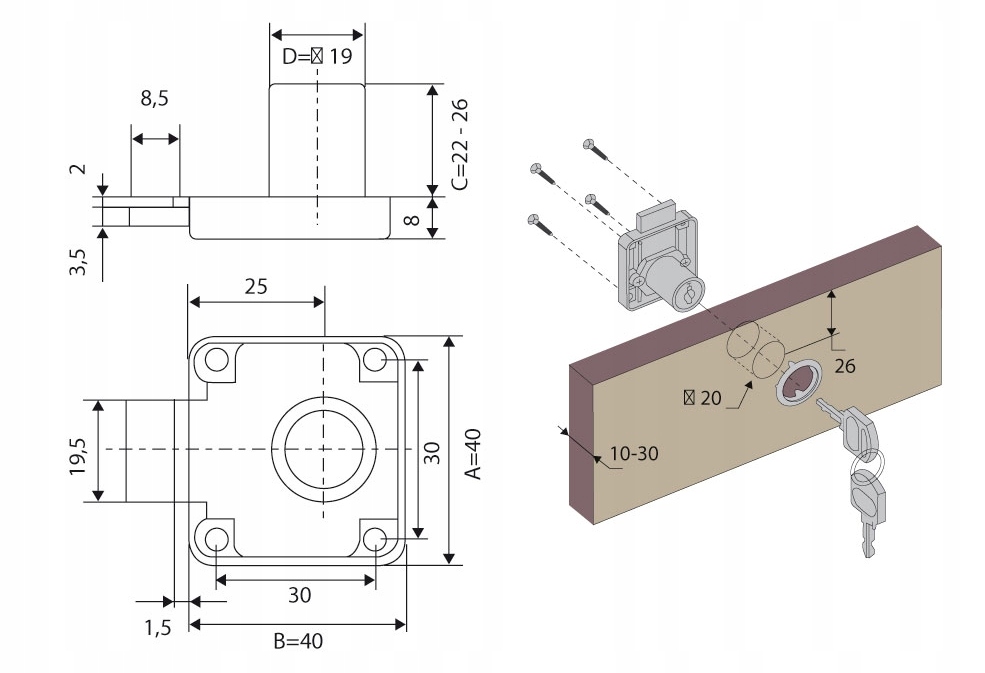 Стандартний, популярний замок найчастіше використовується для різних типів шаф, меблів і барів.