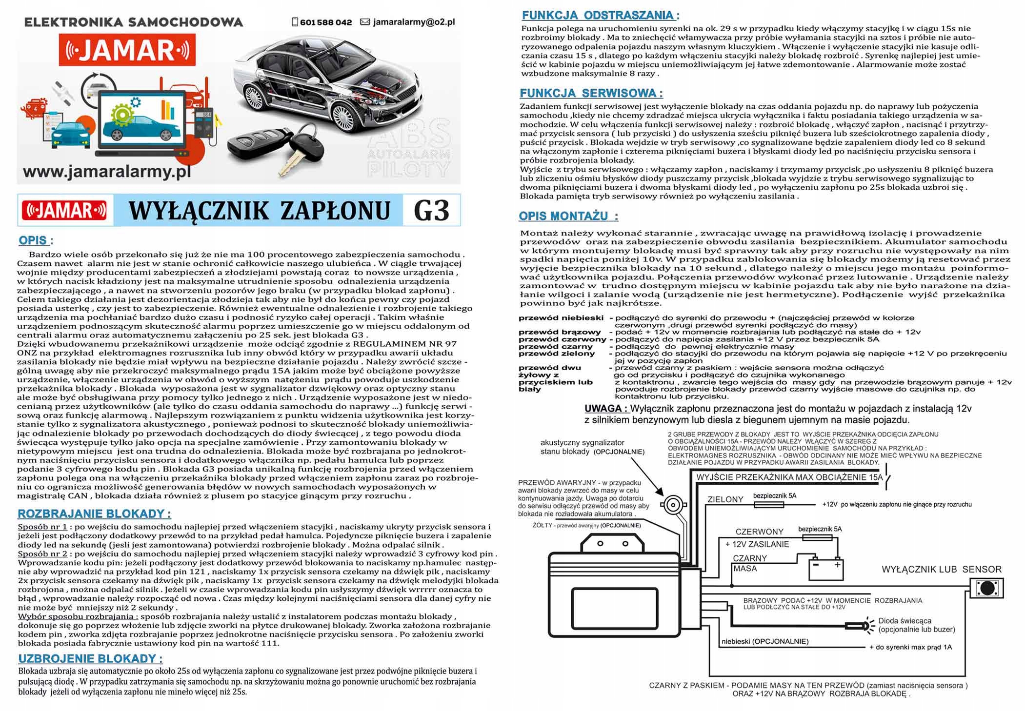 Замок призначений для автомобілі з бензиновими та дизельними двигунами Дякуємо Якщо замок оснащений функцією відкладеного спрацьовування, немає проблем із запуском автомобіля після випадкового вимкнення двигуна на перехресті чи залізничному переїзді, що підвищує безпеку користувача транспортного засобу. Замок ставиться на охорону лише через 30 секунд після вимкнення запалювання. Якщо ми вимкнемо і ввімкнемо запалювання менше ніж на 30 секунд, ми зможемо продовжити рух, не знімаючи замок. Що ще істотно впливає на ефективність безпеки автомобіля? Якщо злодій хоче вкрасти машину, він спочатку спробує знайти в нашій машині охоронний пристрій, щоб позбутися його.Відправною точкою, яка полегшує роботу, є сигнальний діод, який слідує за діодом, як нитка до м'яч, ми можемо дістатися до місця, де заховано пристрій безпеки. Щоб уникнути такої ситуації та ще більше підвищити ефективність замка G3, рекомендується не встановлювати світлодіодний сигнальний діод замість