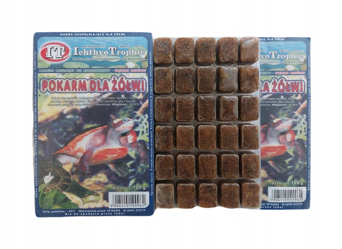 1 блістер містить 100 г корму, розділеного на 30 кубиків від відомої компанії Ichtio Trophic.