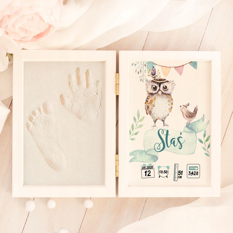 - Елегантна біла рамка в формі, що відкривається. З правого боку розмістимо табличку з чарівним зображенням сови та лісового птаха. Вони сидять на блакитній стрічці з іменем дитини, а під нею розмістимо іконку зі свідоцтвом про народження дитини.