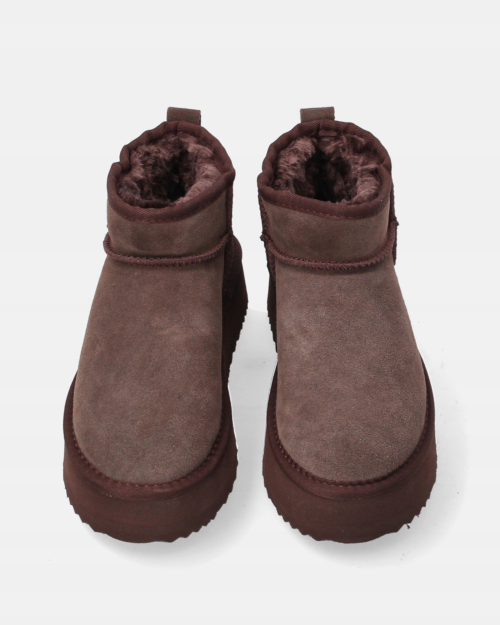 Ідеально підійдуть короткі жіночі снігові черевики з м'якої замші темно-коричневого відтінку взуття для зимових днів. Салон утеплений приємний на дотик, синтетичне хутро, яке забезпечує тепло і комфорт. Модель вбудовано на легкій пінопластовій платформі, що гарантує стабільність і добре ізоляція від землі. Простий дизайн робить взуття чудовим із повсякденним, повсякденним стилем.