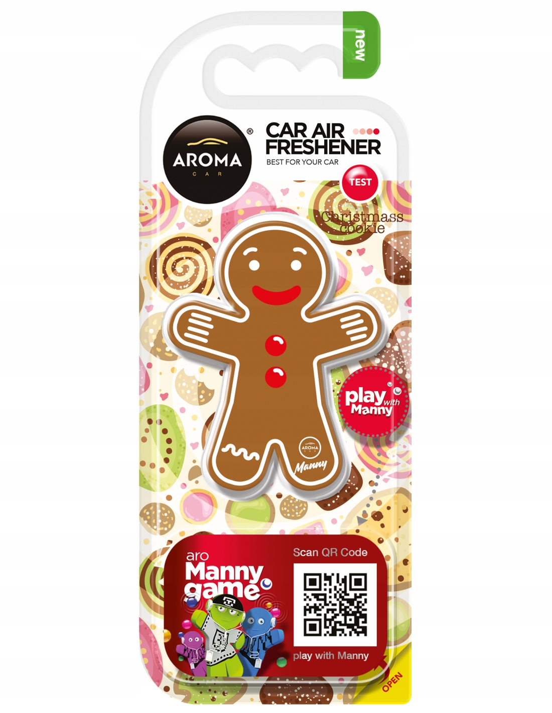 Печиво Менні Імбирний хліб – це запашна фігурка у формі різдвяного печива. Просочений приємним ароматом імбирних пряників аромат Aroma Manna зберігається надзвичайно довго в порівнянні з іншими видами автомобільних освіжувачів. Завдяки особливому способу кріплення він ідеально підходить як для вентиляції автомобіля, так і для веселого брелока.