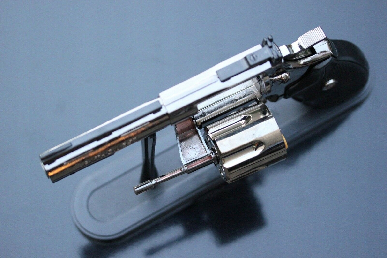 Запальничка також постачається з практичною підставкою, на якій ми можемо показати його та 6 копій куль, які ви можете завантажити в циліндр цього револьвера.