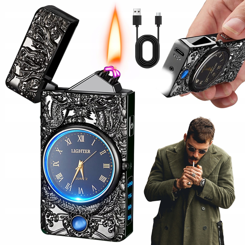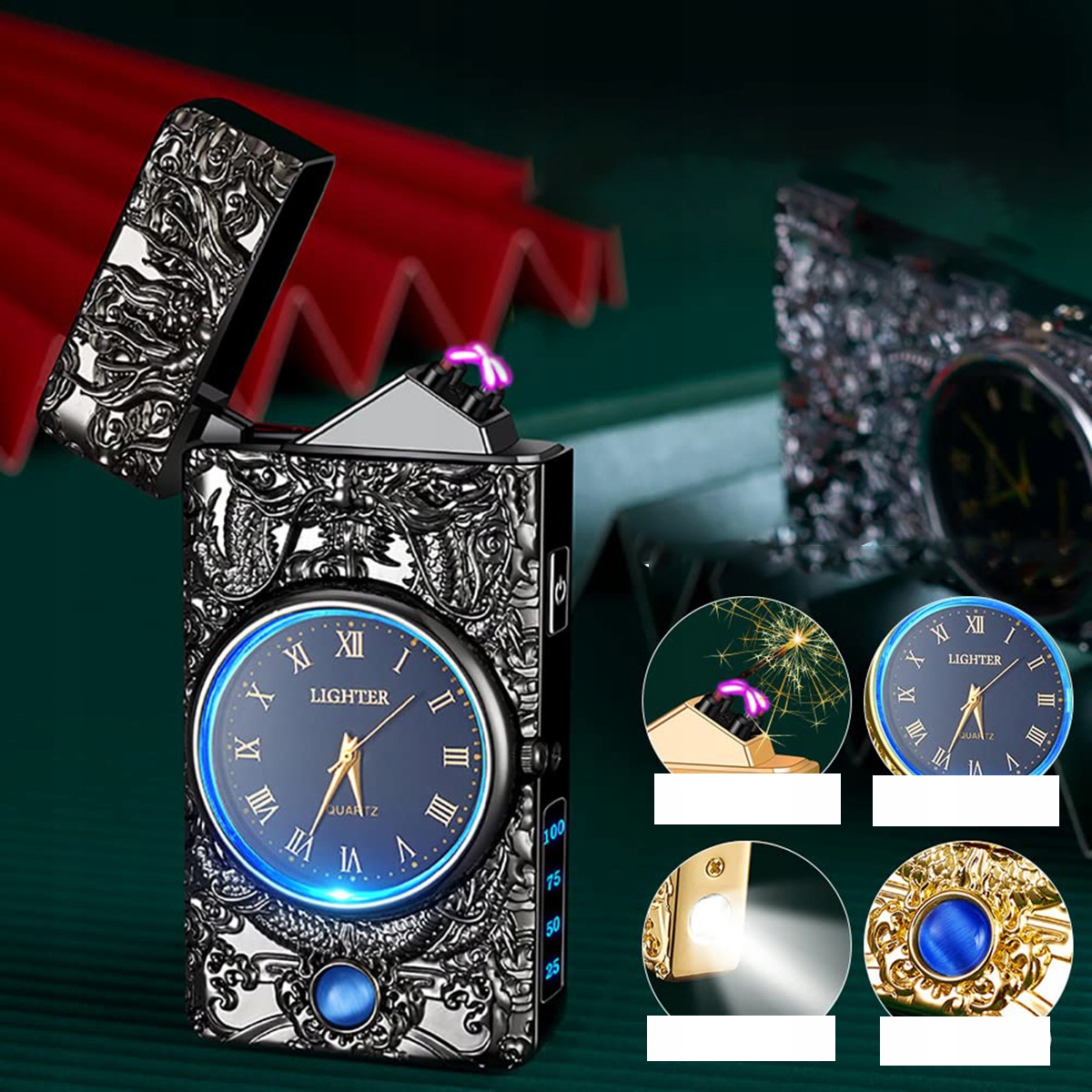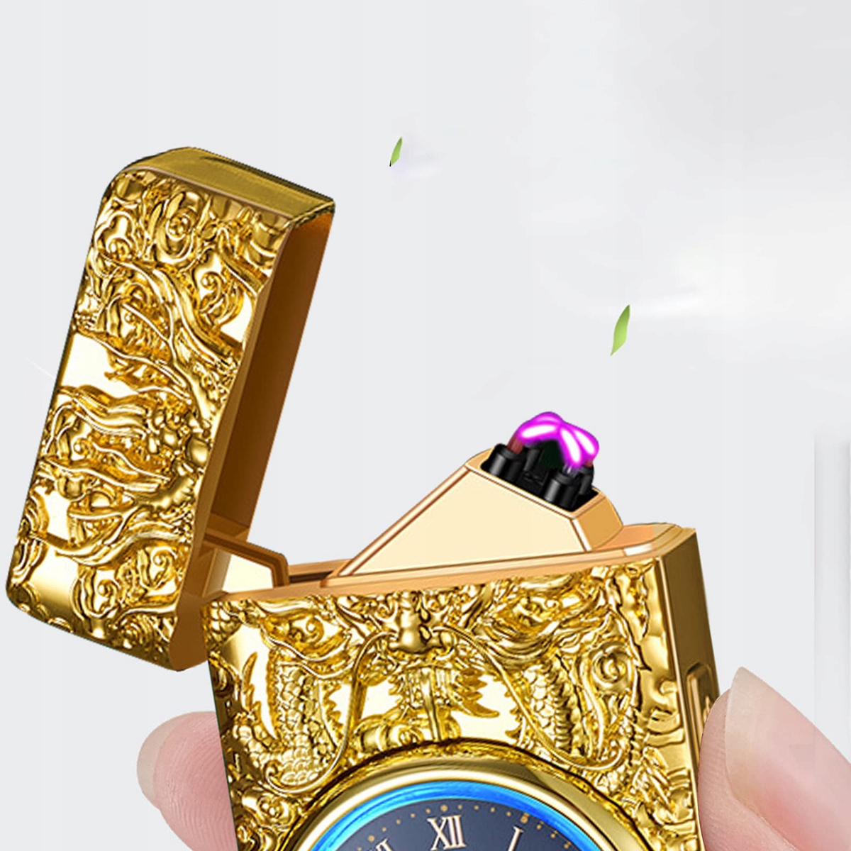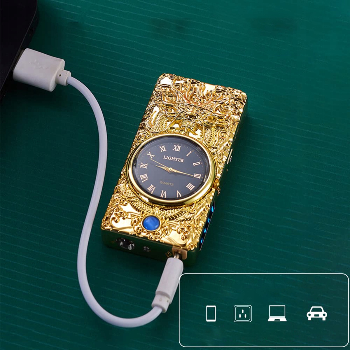 【✨Вишуканий дизайн】: Зовнішній вигляд цієї запальнички прикрашено вишуканим барельєфом, сліпучим годинником, світлодіодним освітленням, синім каменем котяче око, а її благородний і розкішний вигляд привертає увагу. Завдяки нижньому освітленню ви більше не хвилюєтеся про темряву.