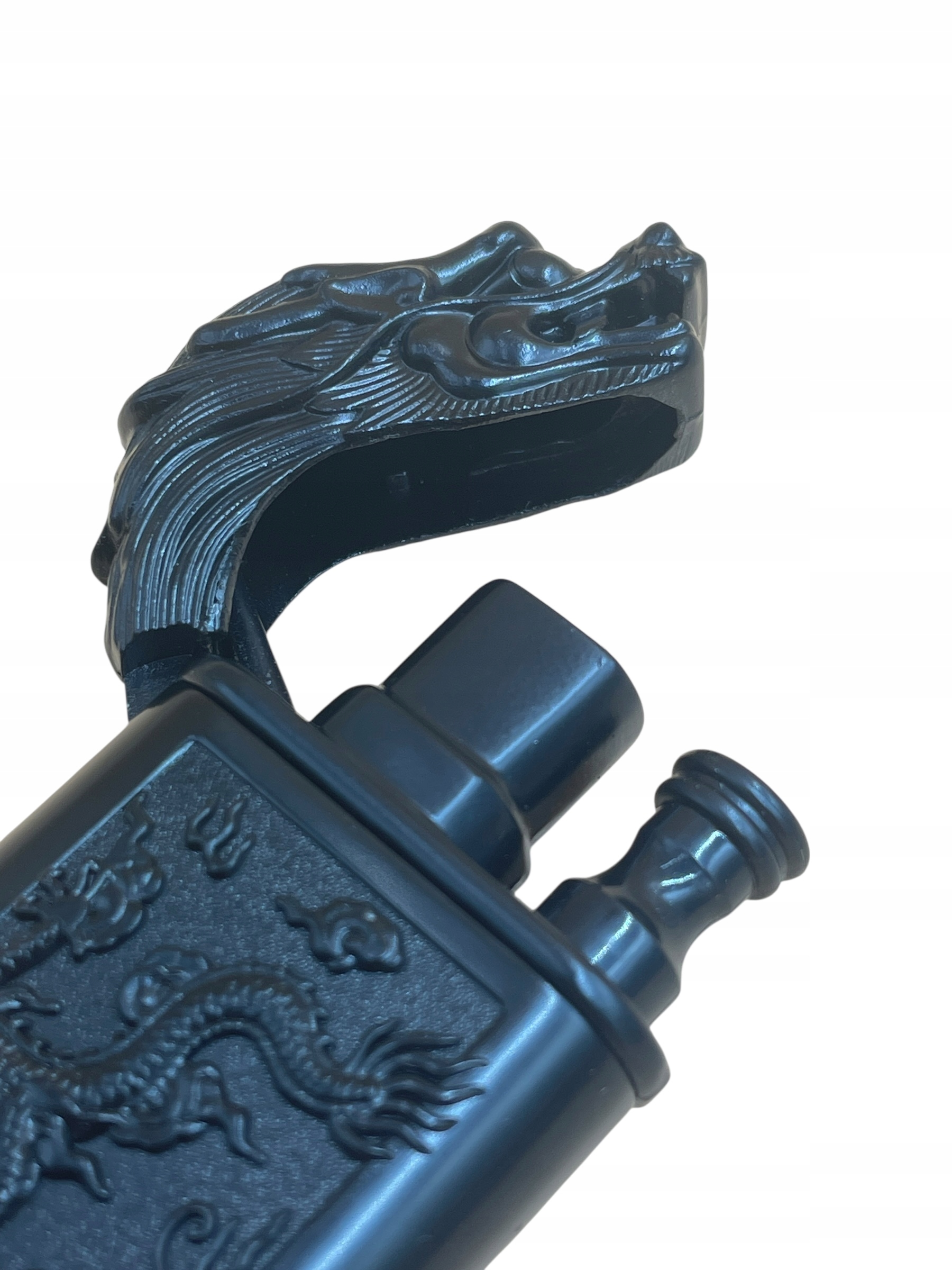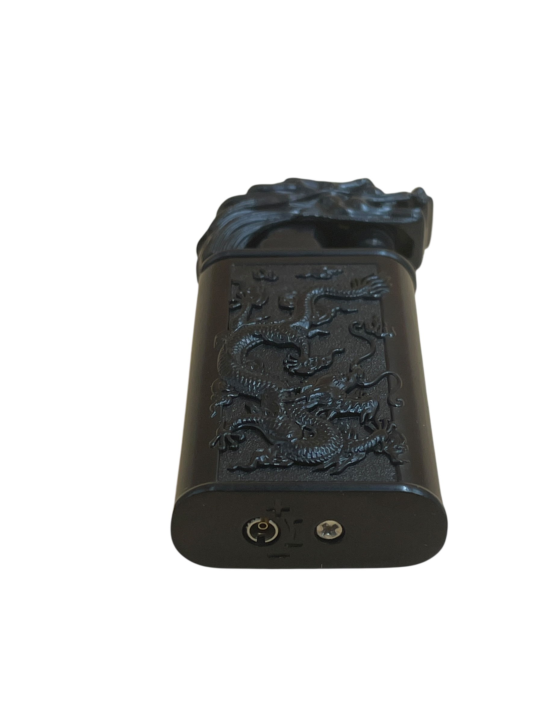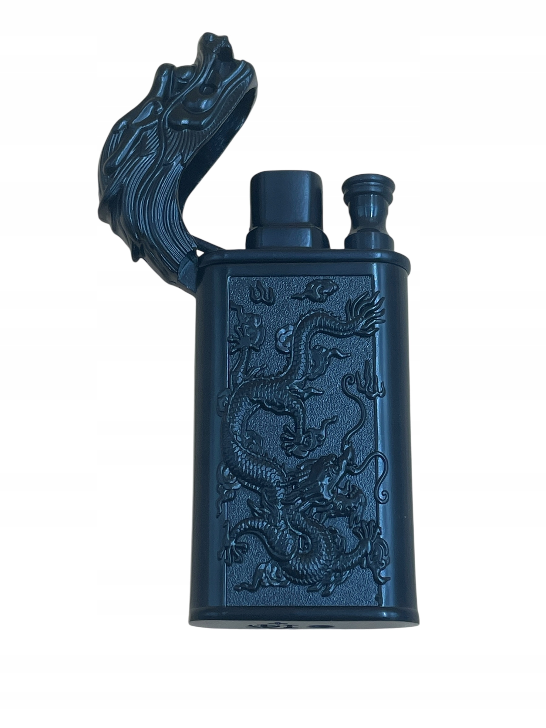 Запальничка повністю виготовлена з металу, прикрашена металевими барельєфами із зображенням дракона та голови дракона на обкладинці