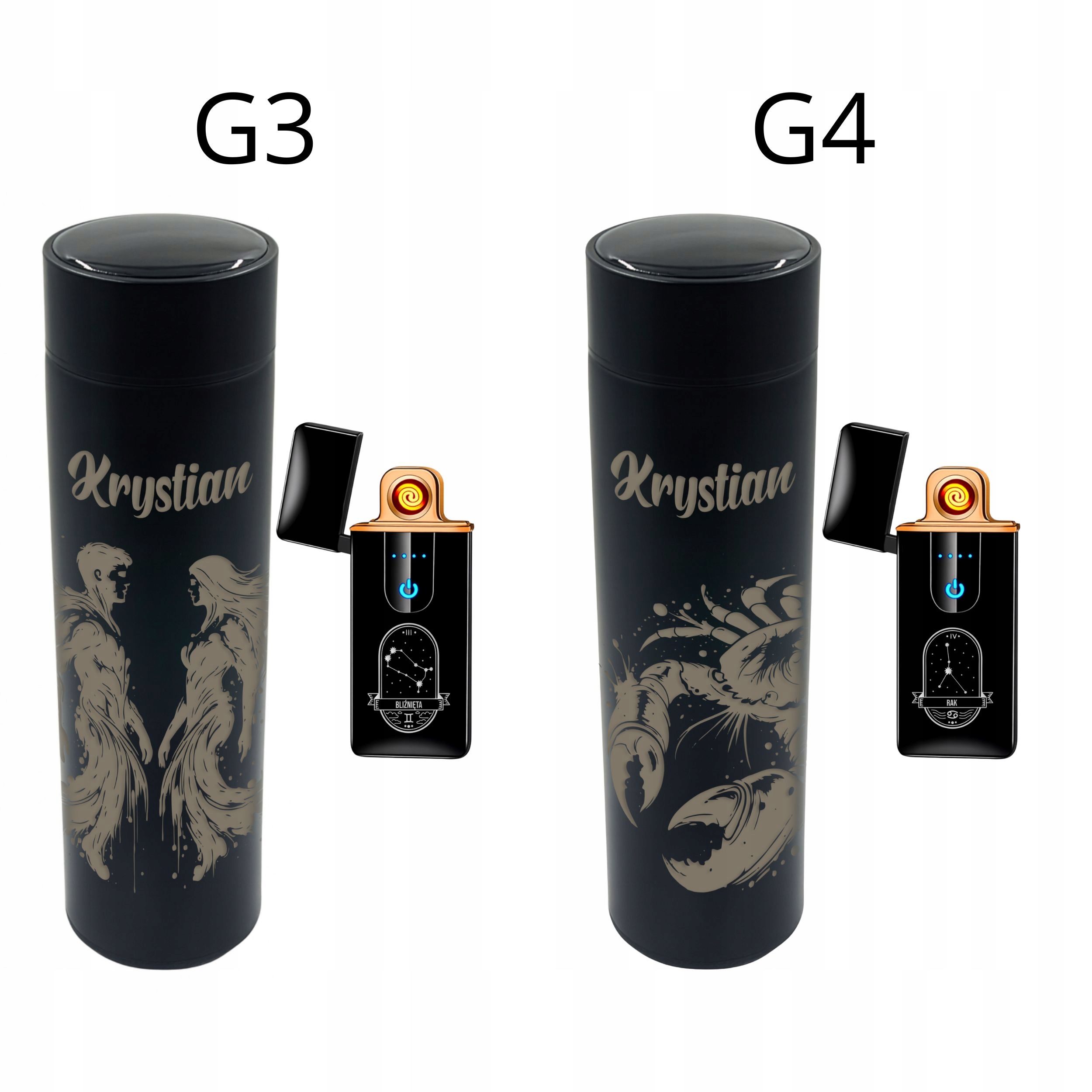Ось ідеальний набір - термос із вигравіруваним ім'ям і візерунком знака зодіаку на вибір + електрична USB-запальничка з гравіюванням сузір'я, що відповідає вибраний один знак.