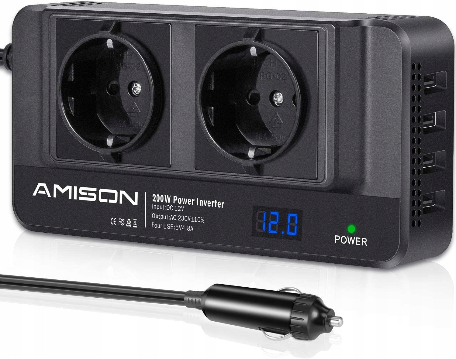 Перетворювач потужністю 200 Вт забезпечує безпечне живлення для ноутбуків, iPad і мобільних телефонів під час водіння. Має 2 розетки змінного струму та 4 USB-порти для зарядки, а також роз’єм автомобільного прикурювача на 12 В. Він компактний, легкий і легко під’єднується до будь-якого роз’єму прикурювача. Ідеально підходить для роботи та розваг. Ви можете заряджати його в будь-який час і будь-де під час активного відпочинку, водіння, кемпінгу тощо.